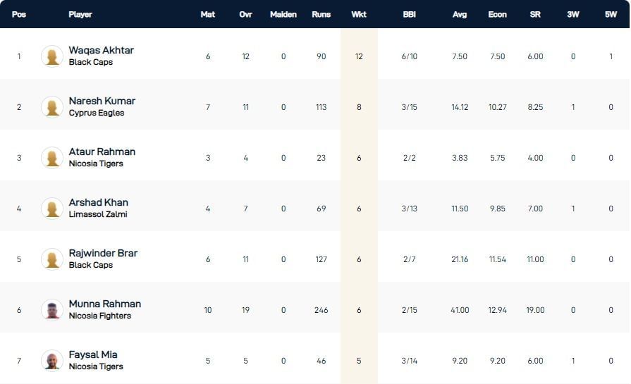 Cyprus Eagles' Naresh Kumar, who has snared eight wickets, occupies second position on the wicket-taking charts. He has 3/15 as his best performance and has been taken for an average of 10.27 runs per over.