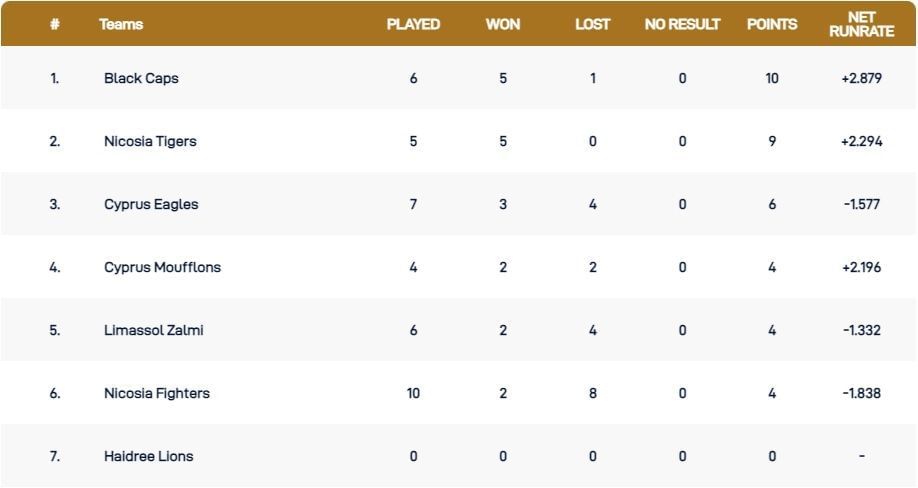 Black Caps and Nicosia Tigers occupy the top two spots in the Cyprus T10 League 2021 points table. Both sides have registered five victories thus far.