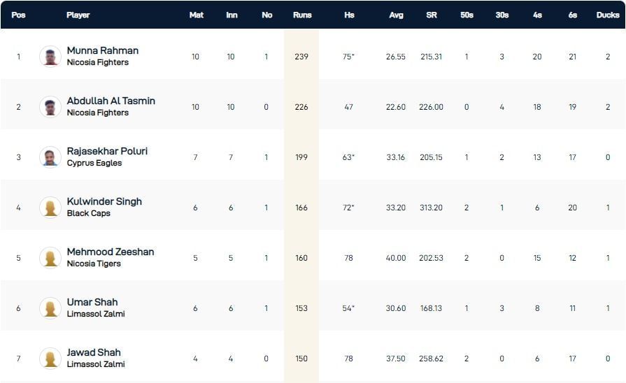 Nicosia Fighters' Munna Rahman is still the highest run-scorer after the fifth day of action in the Cyprus T10 League 2021. He has smashed 239 runs in 10 matches, with a top score of an unbeaten 75. Rahman has scored his runs at an excellent strike rate of 215.31, with the help of 20 fours and 21 sixes.