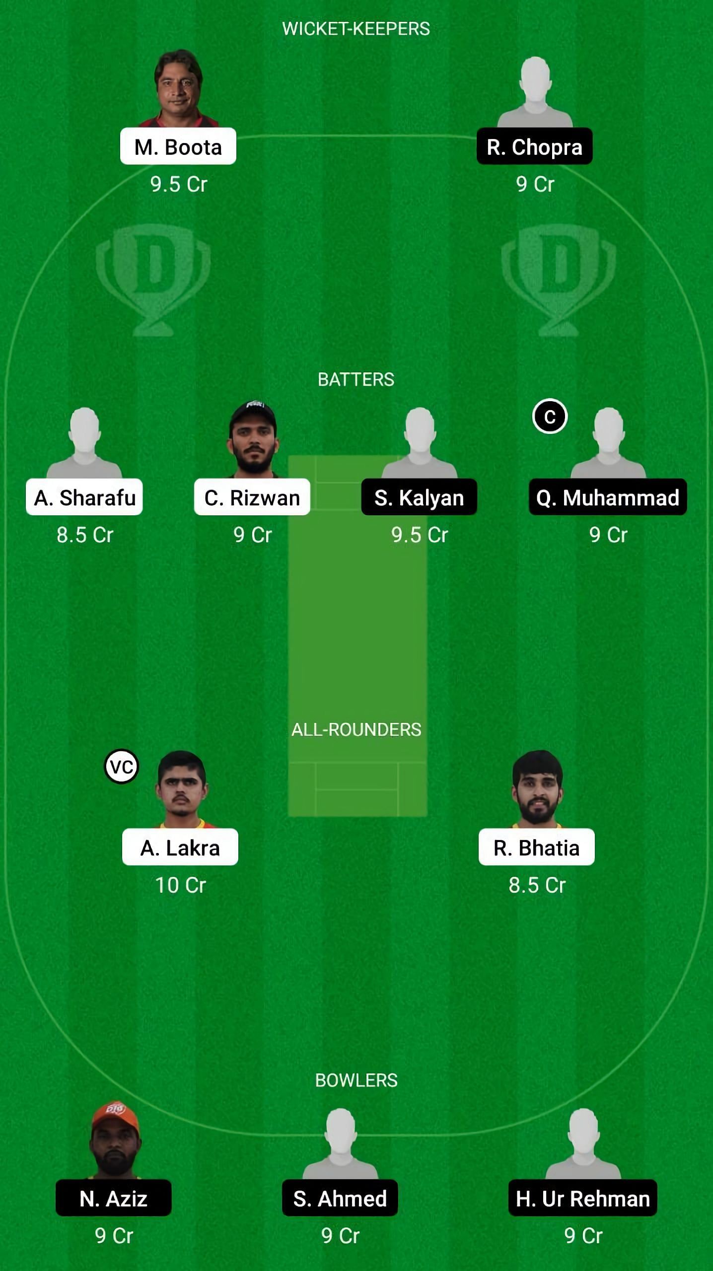 Fantasy Suggestion #1: M Boota, R Chopra, Q Muhammad, A Sharafu, C Rizwan, S Kalyan, A Lakra, R Bhatia, S Ahmed, H Ur Rehman, N Aziz