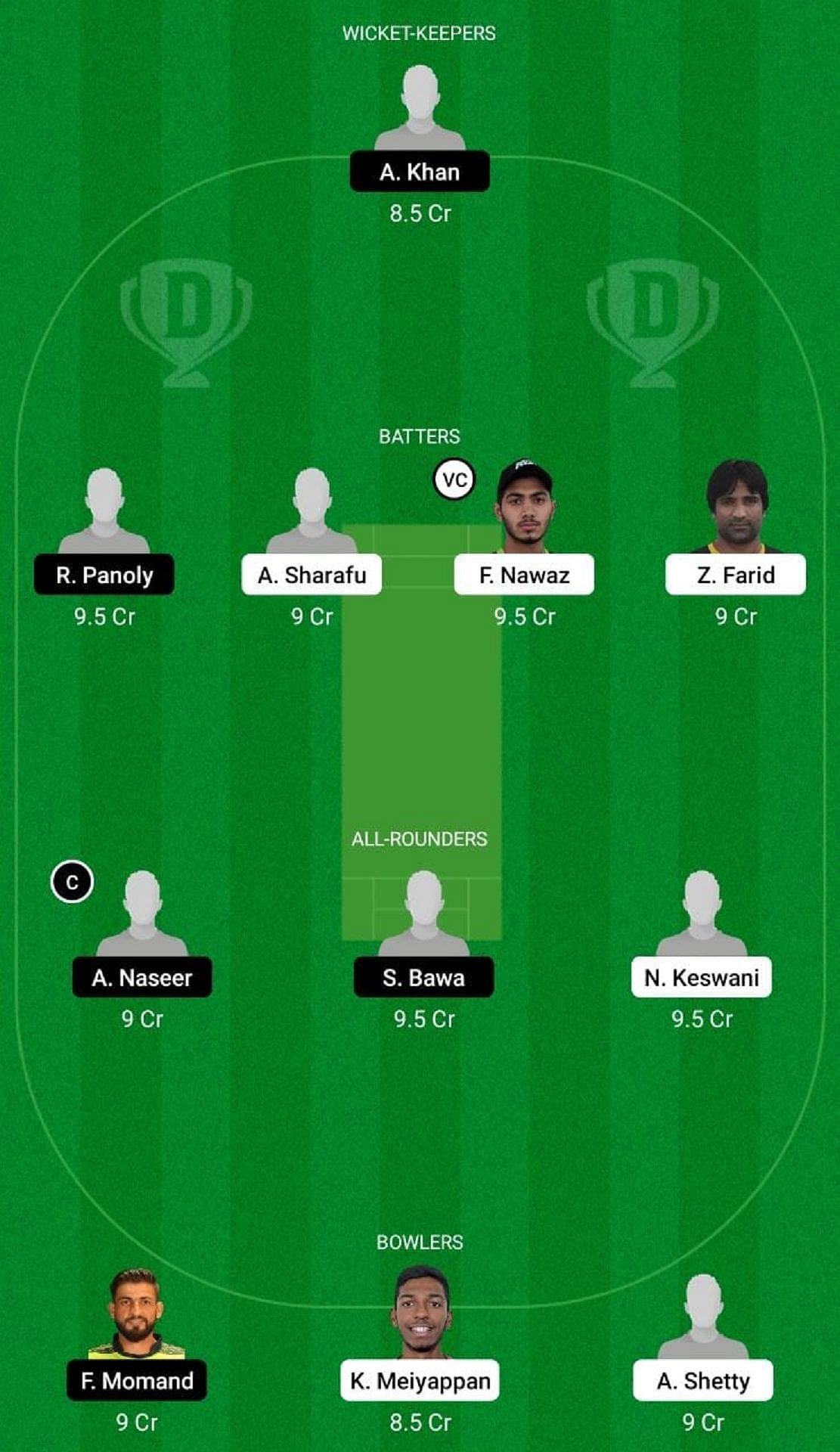 Fantasy Suggestion #1: A Khan, A Sharafu, F Nawaz, R Panoly, Z Farid, A Naseer, N Keswani, S Bawa, A Shetty, F Momand, K Meiyappan