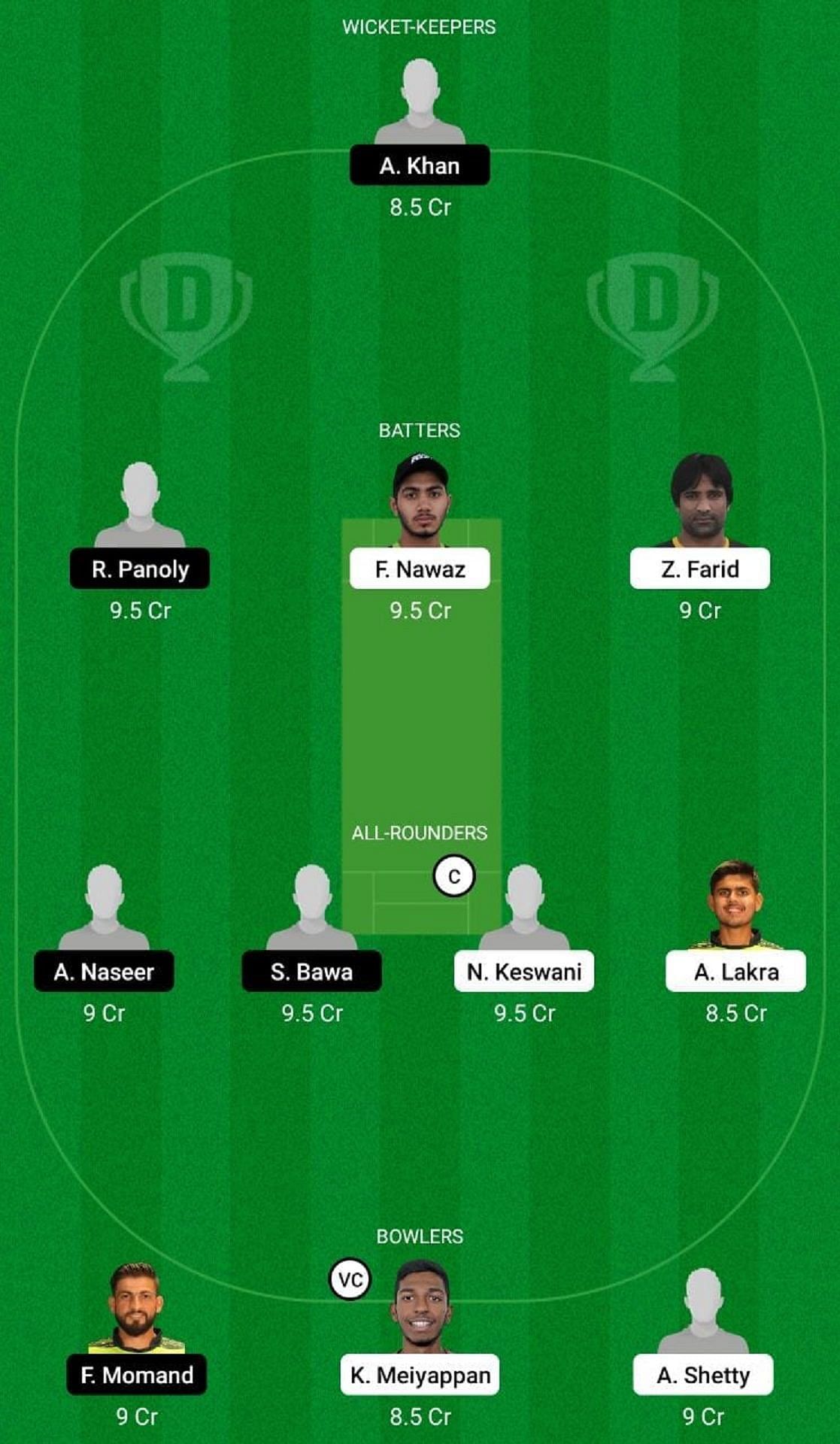 Fantasy Suggestion #2: A Khan, F Nawaz, R Panoly, Z Farid, A Naseer, N Keswani, A Lakra, S Bawa, A Shetty, F Momand, K Meiyappan