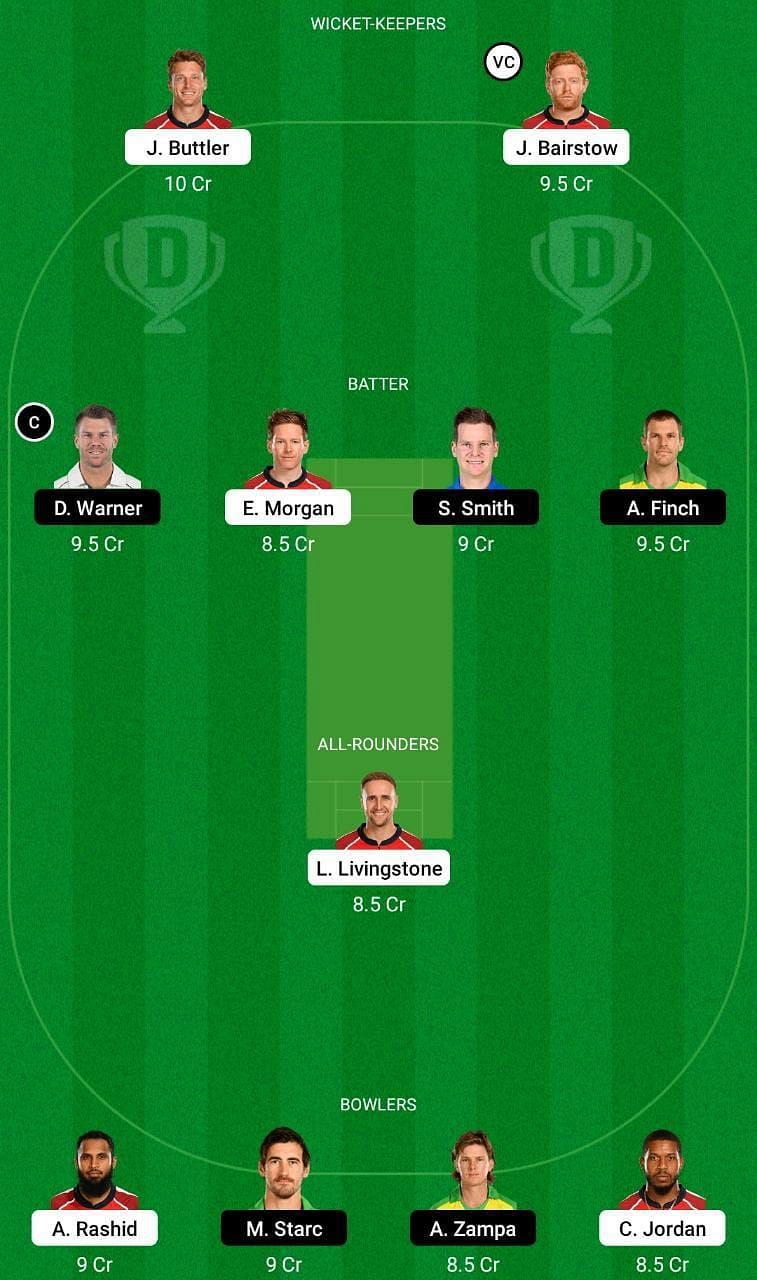 Fantasy Suggestion #2: Jos Buttler, Jonny Bairstow, David Warner, Steve Smith, Aaron Finch, Eoin Morgan, Liam Livingstone, Chris Jordan, Adil Rashid, Mitchell Starc and Adam Zampa