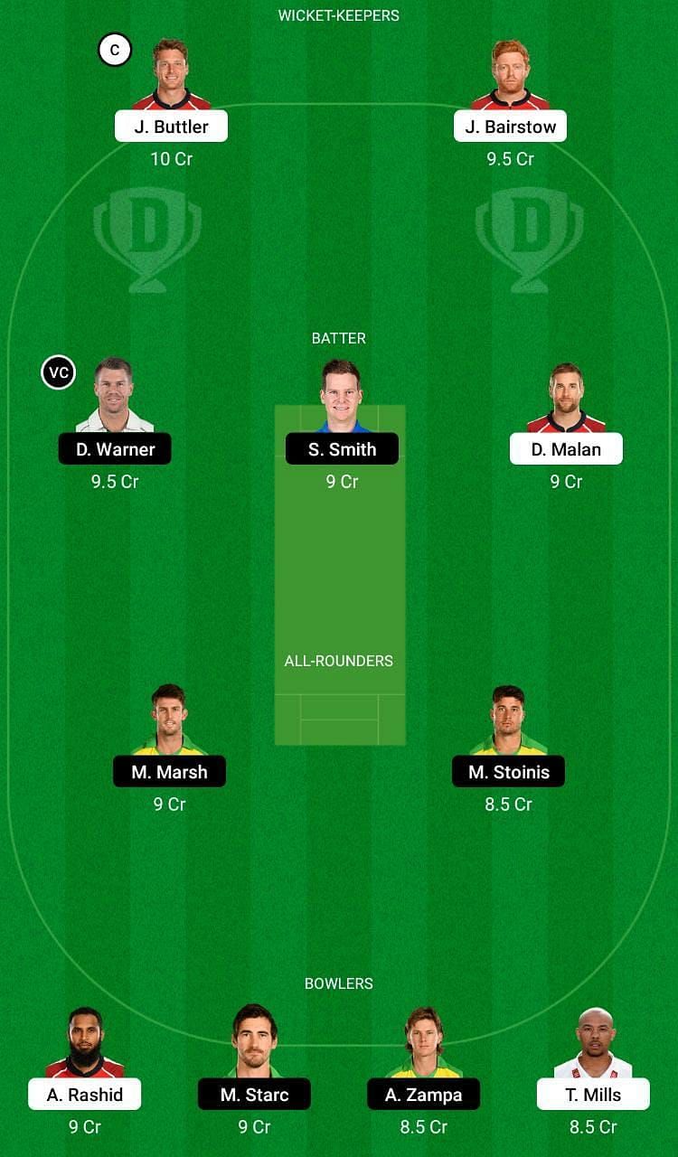 Fantasy Suggestion #1: Jos Buttler, Jonny Bairstow, David Warner, Steve Smith, Dawid Malan, Marcus Stoinis, Mitchell Marsh, Tymal Mills, Adil Rashid, Mitchell Starc and Adam Zampa