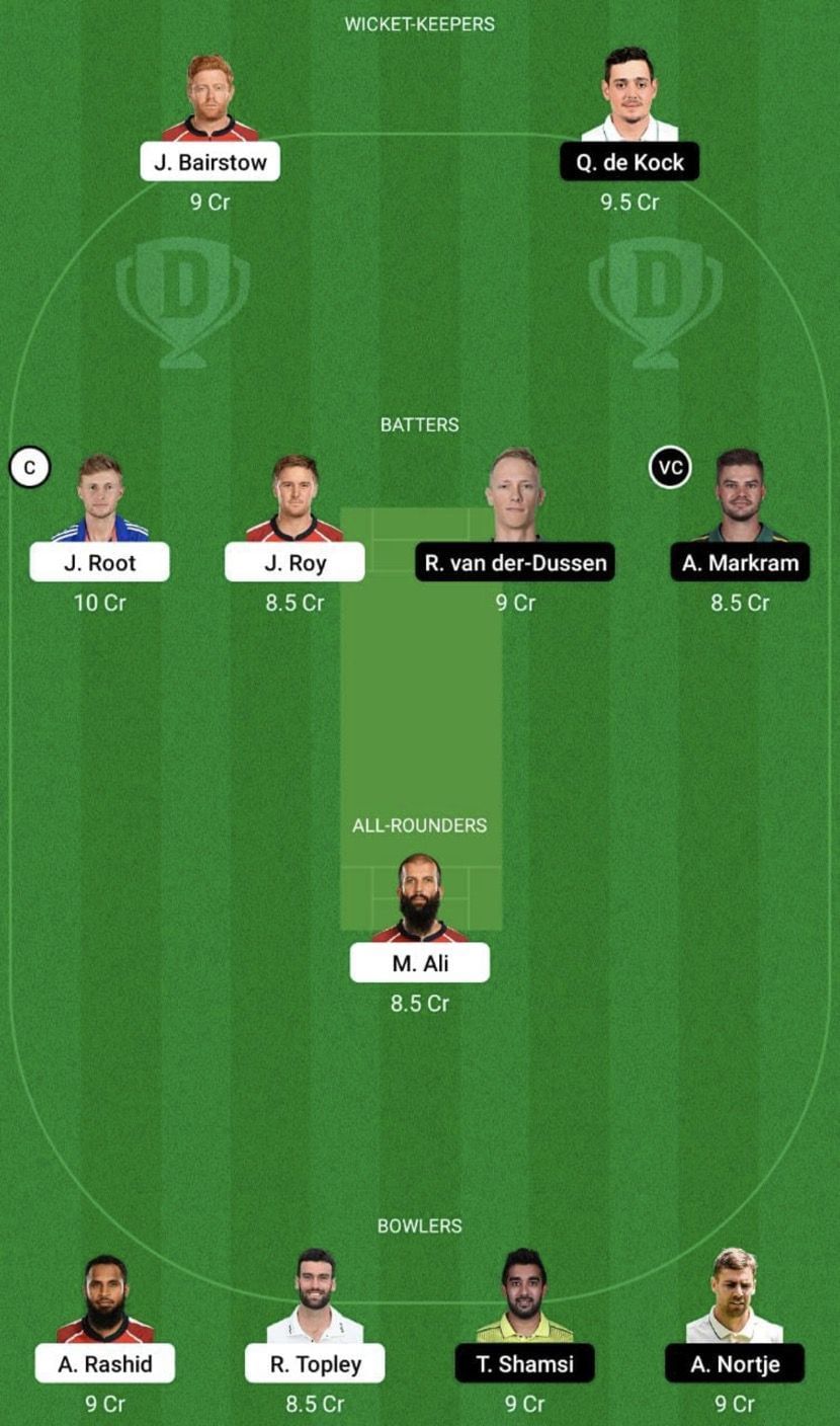 Fantasy Suggestion #1: Jonny Bairstow, Quinton de Kock, Joe Root, Jason Roy, Rassie van der Dussen, Aiden Markram, Moeen Ali, Adil Rashid, Reece Topley, Tabraiz Shamsi and Anrich Nortje.
