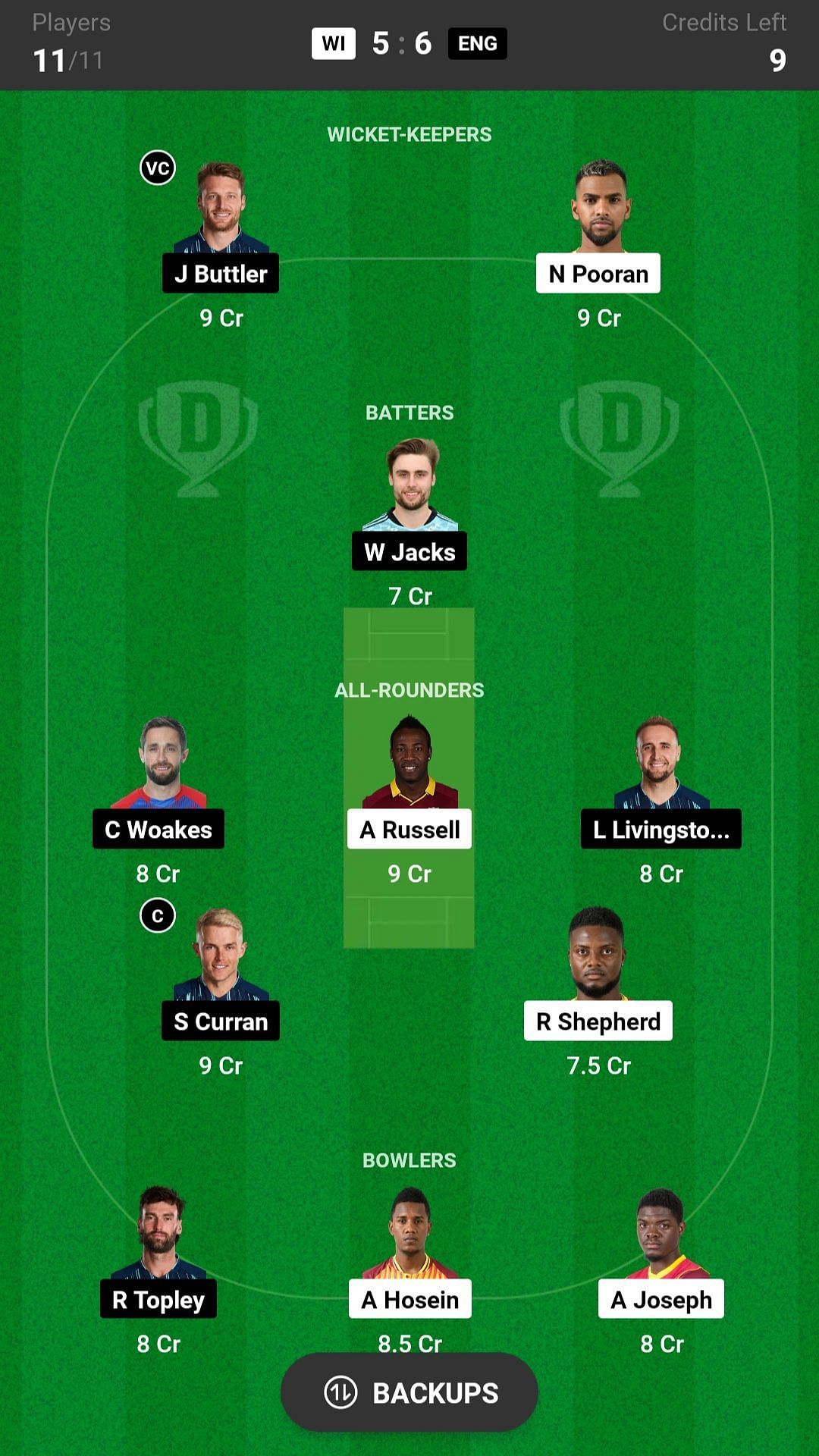 S Curran can perform well both with bat and ball. He loves performing against the West Indies and can perform well in today's nail-biting match. He will bat in the middle order and also complete his quota of overs.