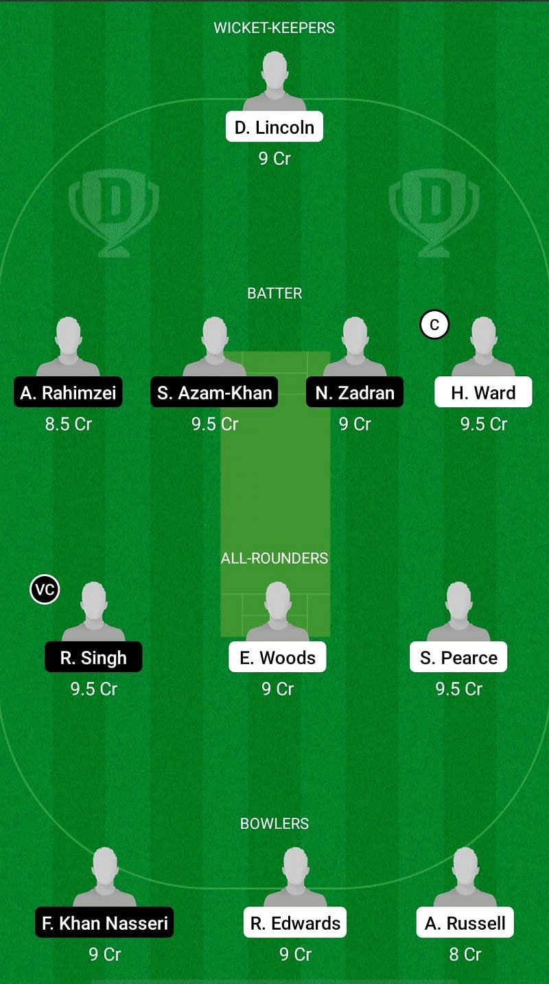 Fantasy Suggestion #2: Dan Lincoln, Nasrullah Zadran, Shoaib Azam, Abdul Shakoor Rahimzei, Harrison Ward, Euan Woods, Rohit Singh, Sam Pearce, Fayaz Nasseri, Rich Edwards, Alex Rusell.