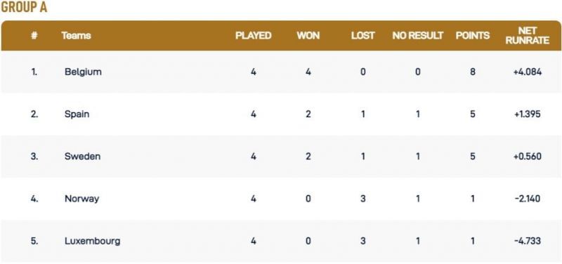 Spain and Sweden follow the table-toppers in the Group A standings. Both sides have five points, with the former having a better net run rate.