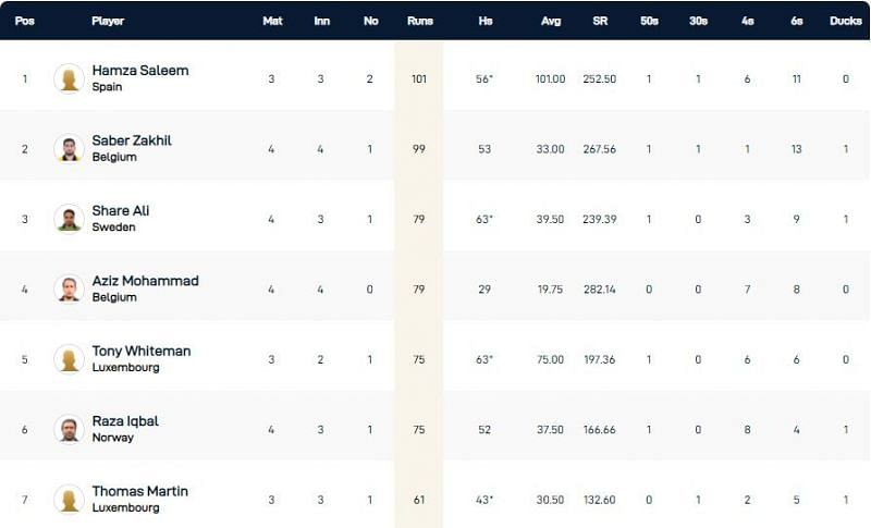 Belgium's Saber Zakhil has slipped to second spot on the run-scoring charts. He has blasted 99 runs so far, with 53 being his best effort. Zakhil has scored his runs at an outstanding strike rate of 267.56, with the help of a solitary four and 13 maximums.