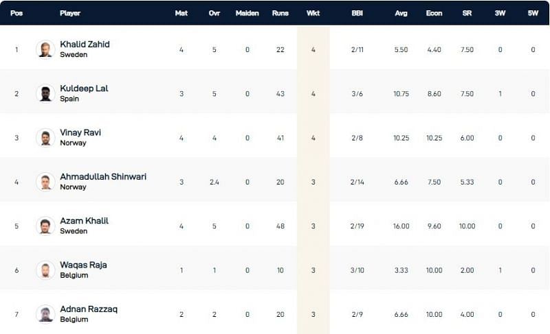 Sweden's Zahid, who has 2/11 as his best performance, has an exceptional economy of 4.40. Spain's Lal has 3/6 as his best figures and has an acceptable economy of 8.60. Norway's Ravi has a best spell of 2/8 and has conceded an average of 10.25 runs per over.