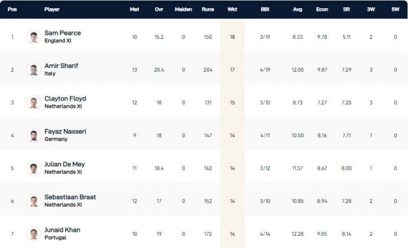 Italy's Amir Sharif, who has picked up 17 wickets, has slipped to second position on the wicket-taking charts. He has 4/19 as his best performance and has conceded an average of 9.87 runs per over.