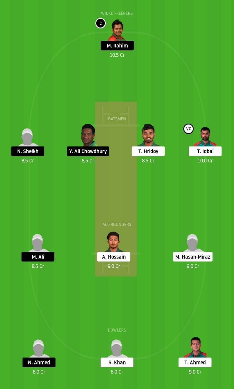 Fantasy Suggestion #1: M Rahim, T Iqbal, T Hridoy, N Sheikh, Y Ali, M Hasan Miraz, M Ali, A Hossain, T Ahmed, N Ahmed and S Khan