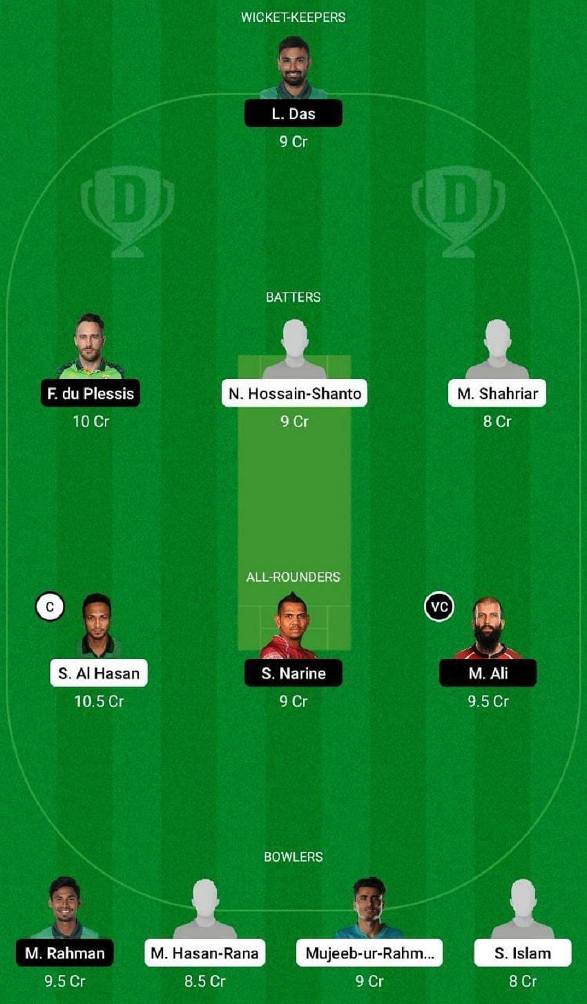 Fantasy Suggestion #1: Liton Das, Faf du Plessis, Najmul Hossain Shanto, Munim Shahriar, Shakib Al Hasan, Sunil Narine, Moeen Ali, Mustafizur Rahman, Mehedi Hasan Rana, Mujeeb ur Rehman and Shafiqul Islam