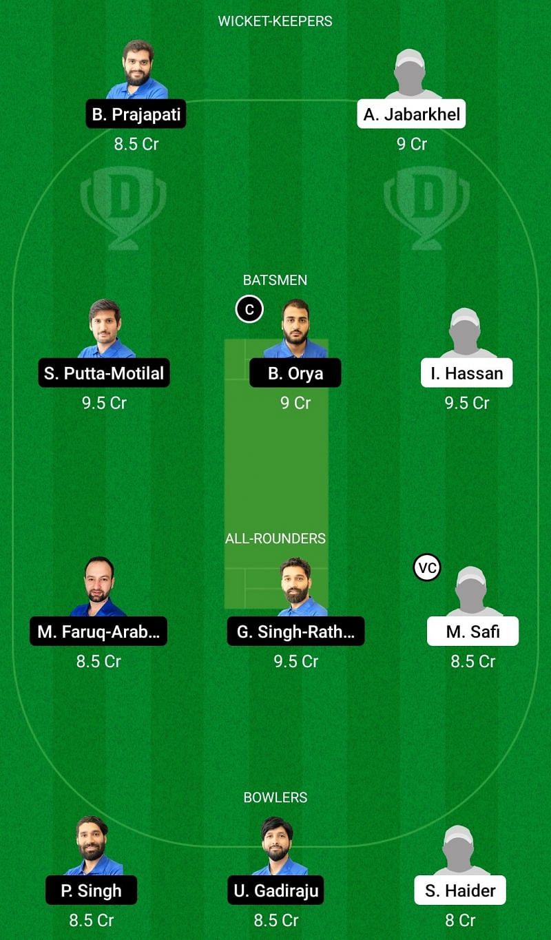 Fantasy Suggestion #1: Brijesh Prajapati, Muhammad Akbar Jabarkhel, Suraj Lal Putta Motilal, Basit Orya, Imran Khan Hassan, Mohammad Faruq Arabzai, Gaurav Singh Rathore, Muhammad Sharif Safi, Prakash Singh, Ujwal Gadiraju, Salman Haider