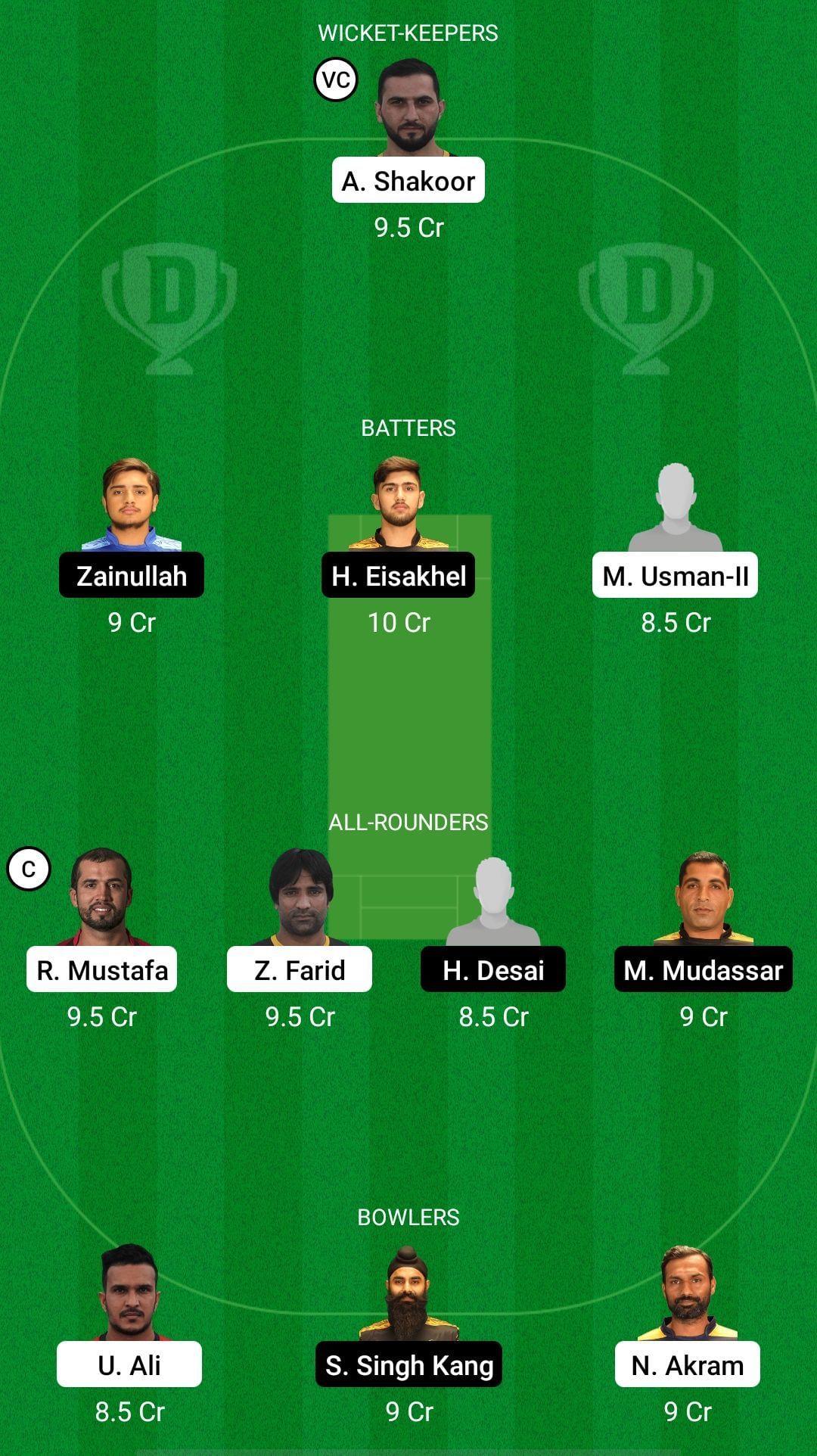 Fantasy Suggestion #1: Abdul Shakoor, Zainullah, Hassan Eisakhel, Muhammad Usman, Rohan Mustafa, Zawar Farid, Harsh Desai, Muhammad Mudassar, Umair Ali, Simranjeet Singh Kang, Naseer Akram.