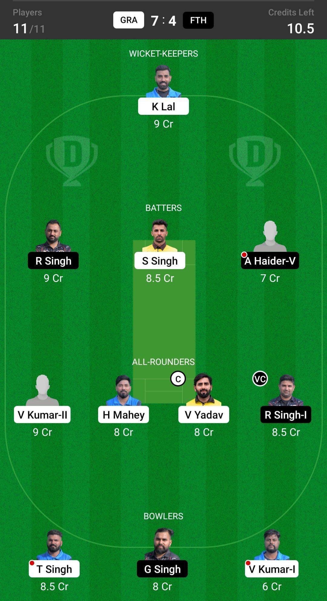 V Yadav will bat in the top order and also complete his quota of two overs, making him the safest pick for the captaincy. He is expected to play a crucial innings in today's match. Yadav has already earned 552 points in the last seven matches.