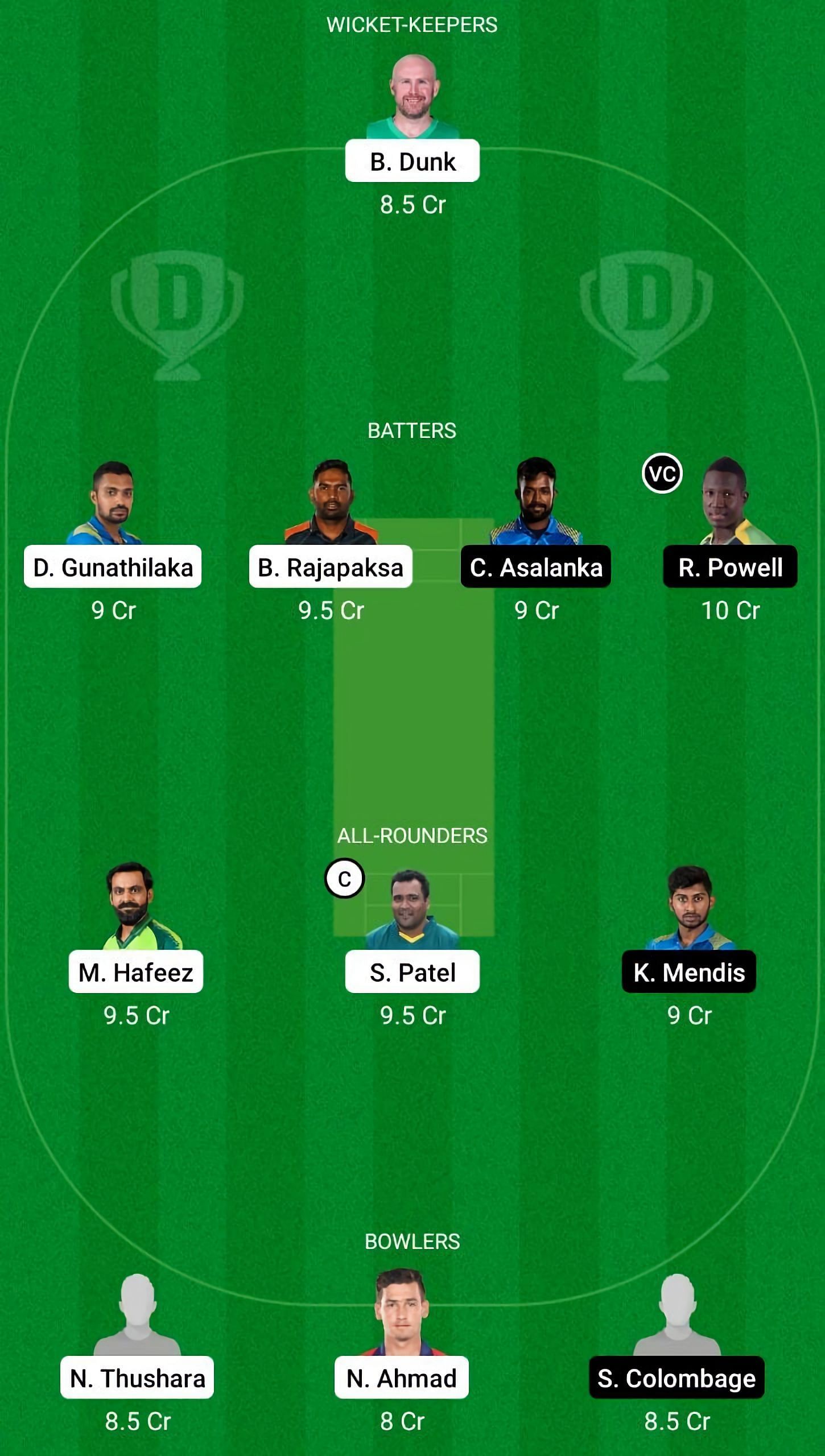 Fantasy Suggestion #1: B Dunk, R Powell, B Rajapaksa, C Asalanka, D Gunathilaka, S Patel, M Hafeez, K Mendis, N Ahmad, S Colombage, N Thushara
