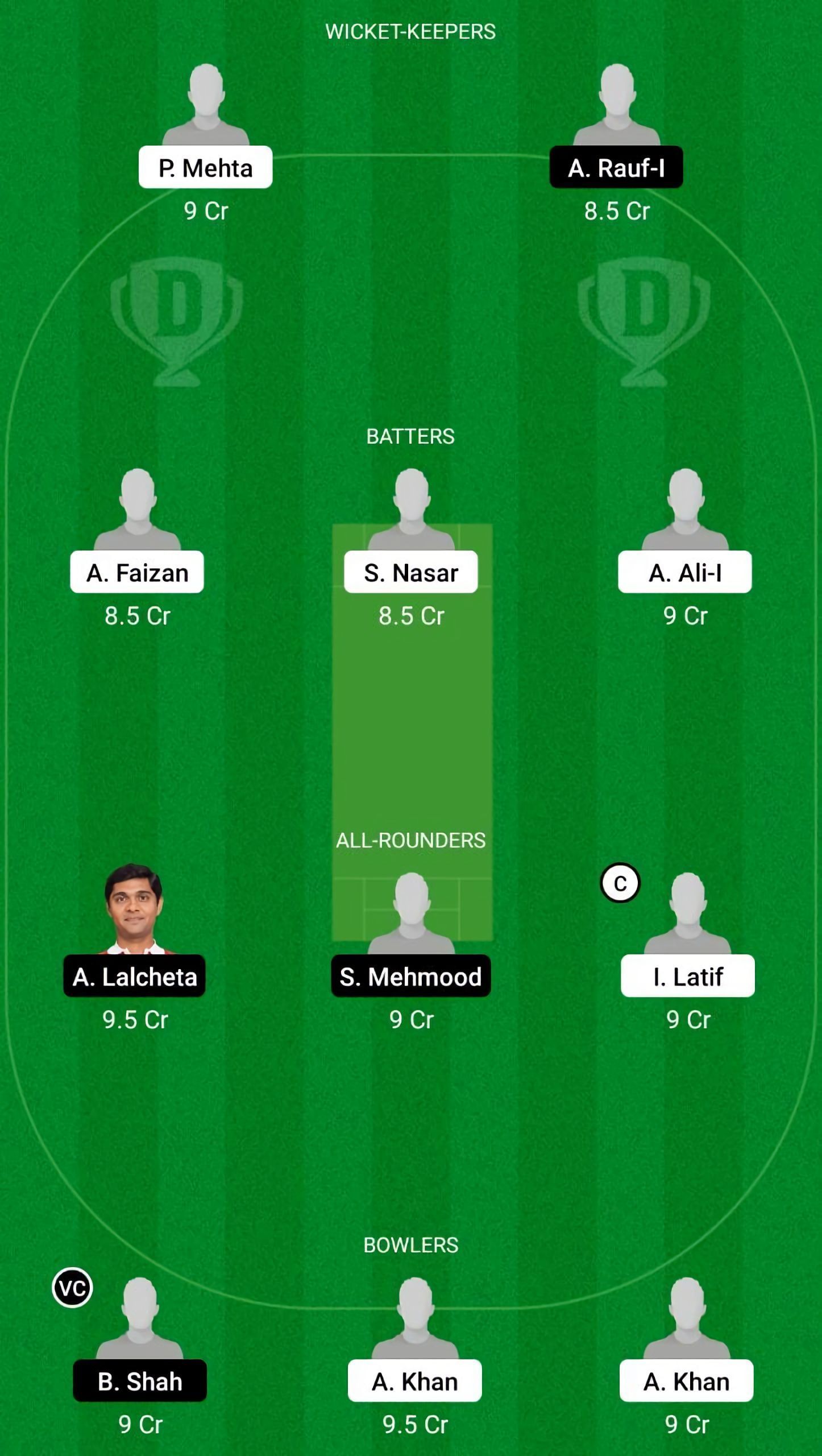 Fantasy Suggestion #2: A. Rauf, P. Mehta, A. Ali, S. Nasar, A. Faizan, A. Lalcheta, S. Mehmood, I. Latif, B. Shah, A. Khan, A. Khan