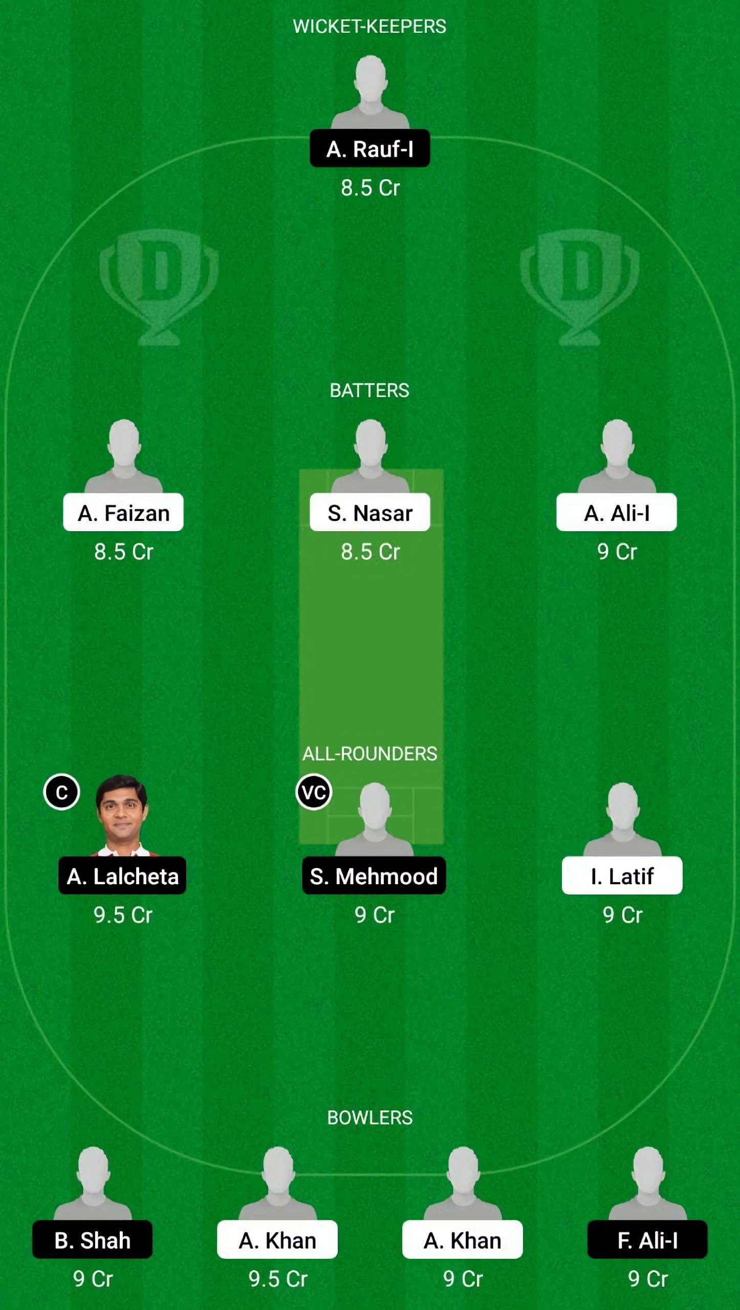 Fantasy Suggestion #1: A. Rauf, A. Ali, S. Nasar, A. Faizan, A. Lalcheta, S. Mehmood, I. Latif, B. Shah, A. Khan, F. Ali, A. Khan