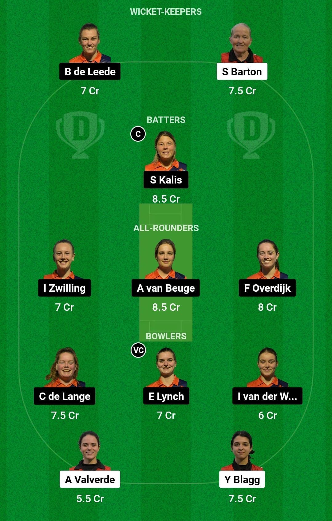 Netherlands Women are in superb form and will start as favorites. Thus, at least seven of their players can be picked. Top-order batters and all-rounders could be key and hence, the likes of Babette de Leede, Sterre Kalis, Iris Zwilling, Annemijn van Beuge and Eva Lynch will be the ones to watch out for.