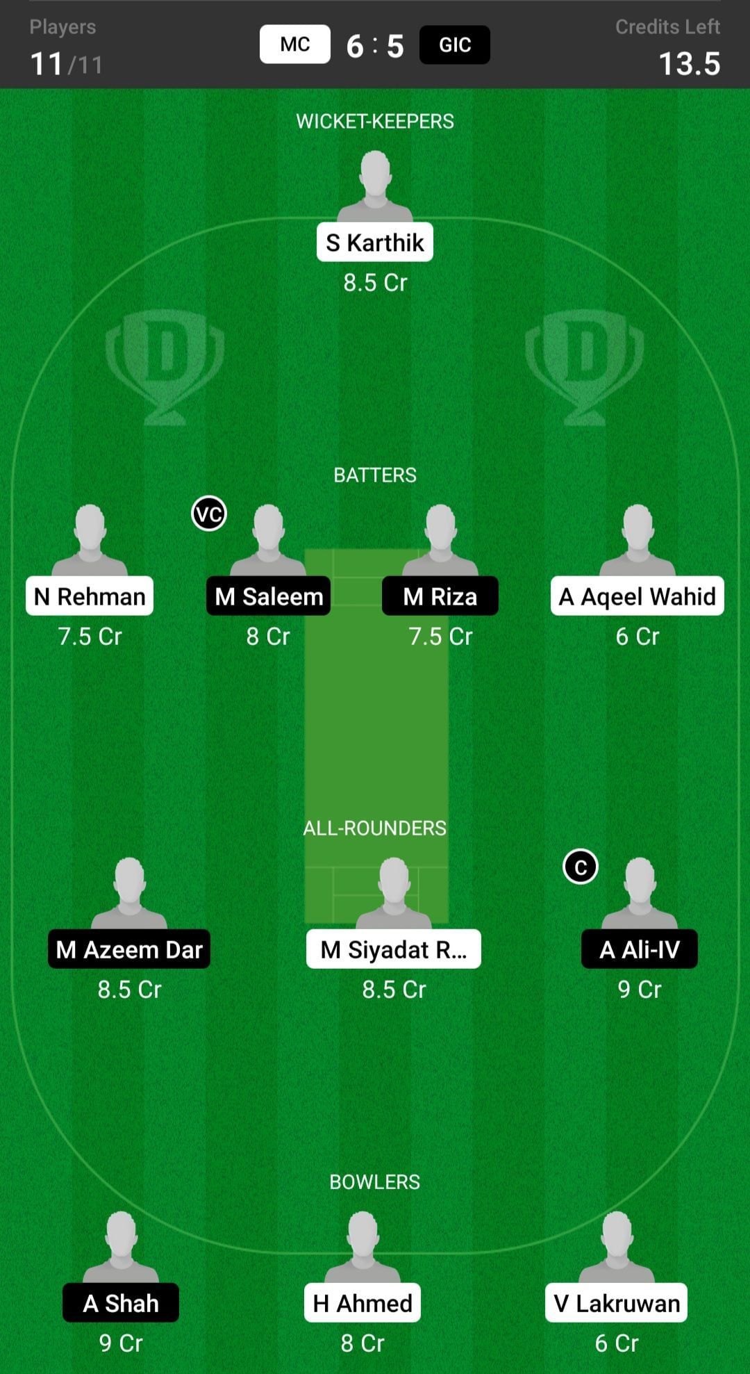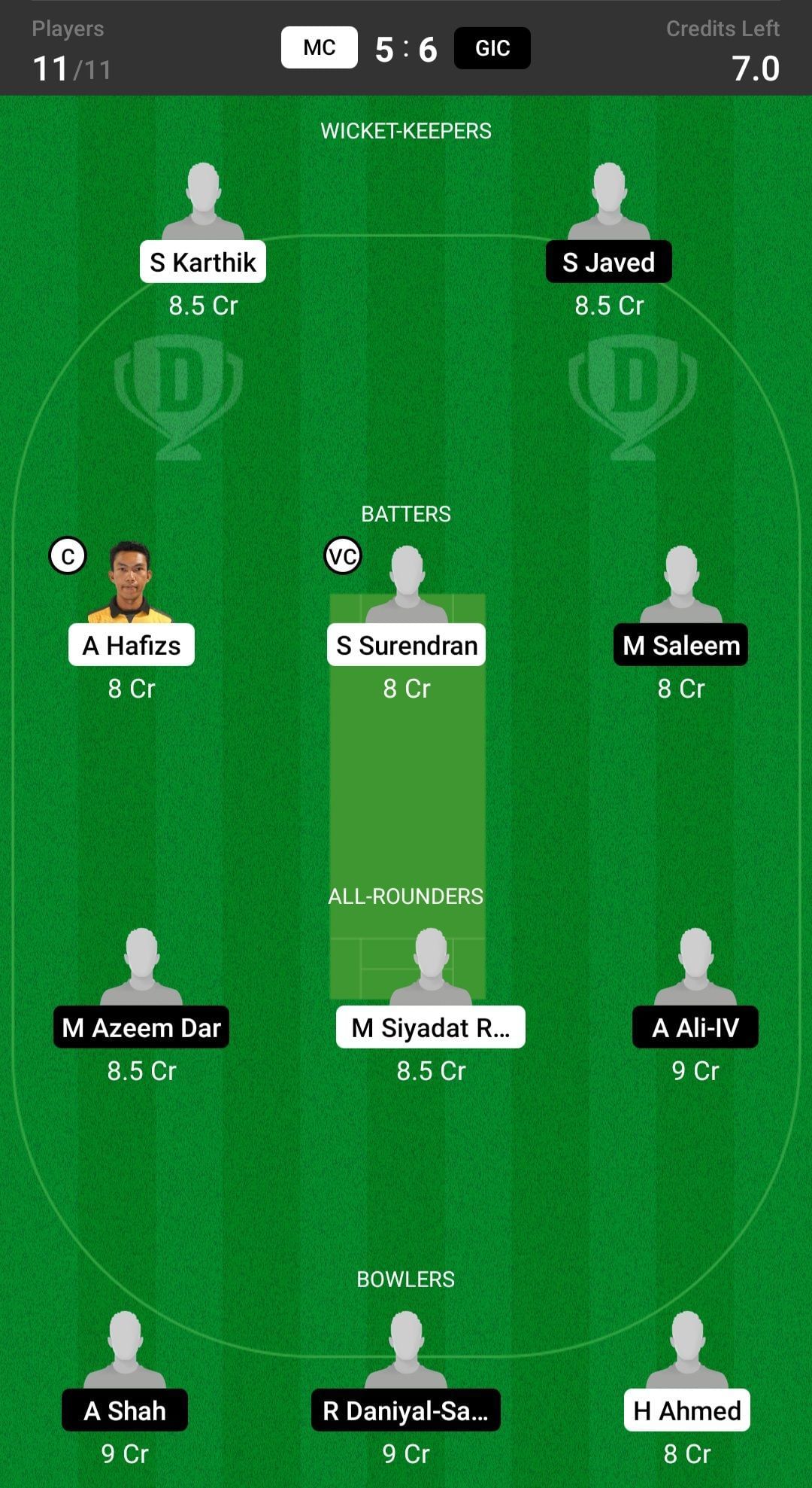 S Surendran and M Saleem are the two best batter picks. A Hafizs has played well in the last few games, so he's also a good pick.
