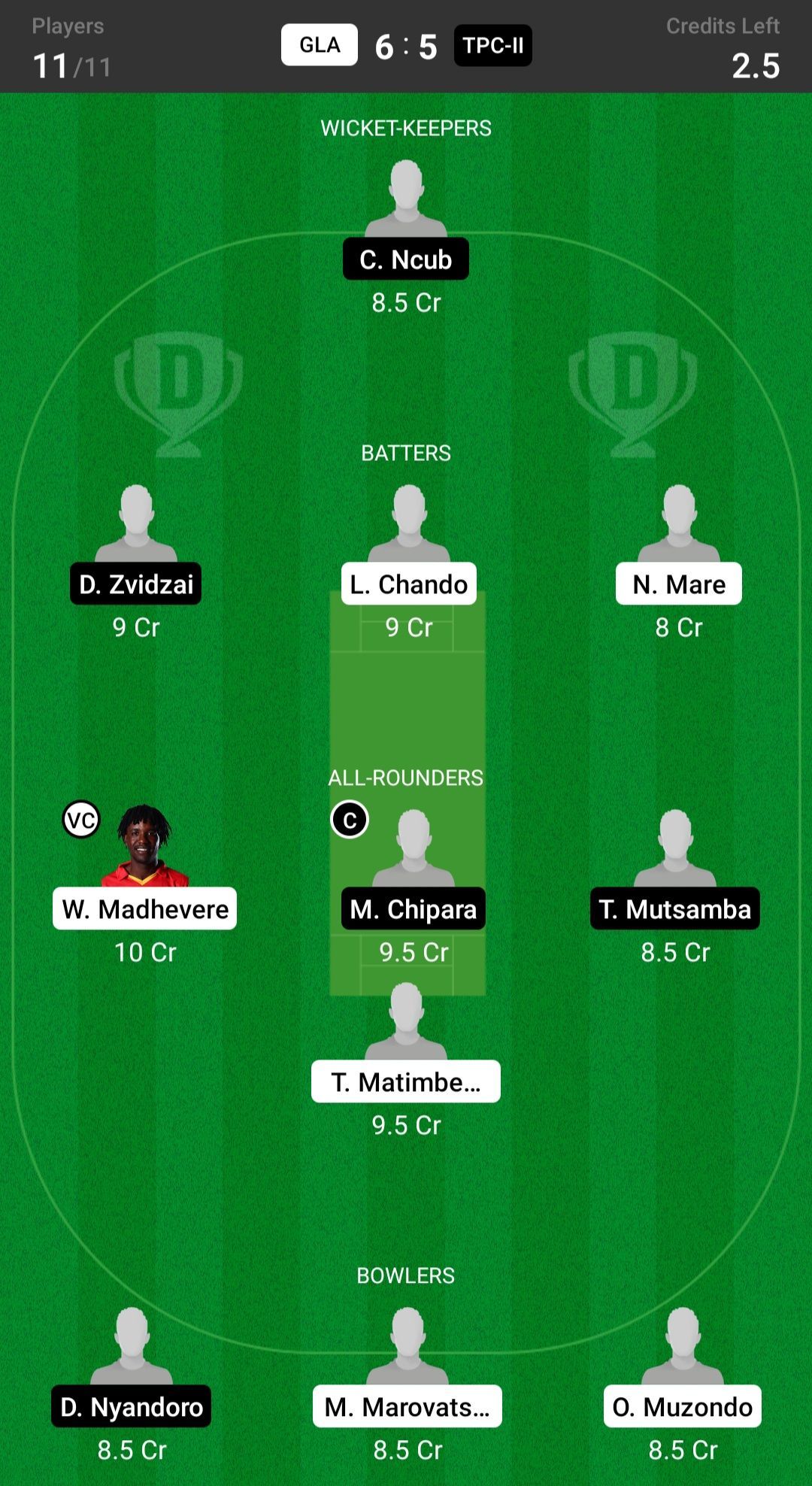 Since the pitch is well-balanced, you can make M Chipara the captain of the grand league teams as he bowled well in the previous domestic tournament. He picked up three wickets in the last match against the Great Zimbabwe Cricket Club.
