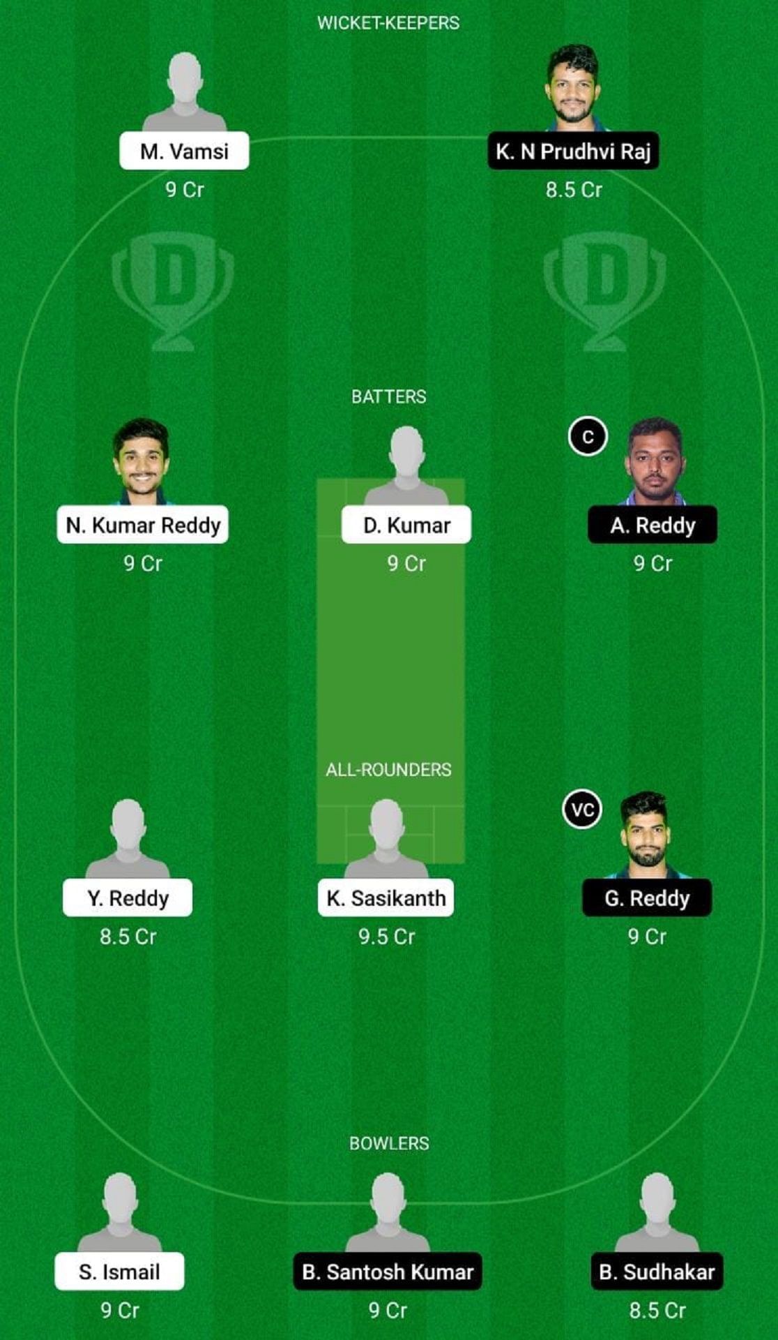 Fantasy Suggestion #1: K N Prudhvi Raj, M Vamsi, A Reddy, N Kumar Reddy, D Kumar, G Reddy, K Sasikanth, Y Reddy, B Santosh Kumar, B Sudhakar, S Ismail