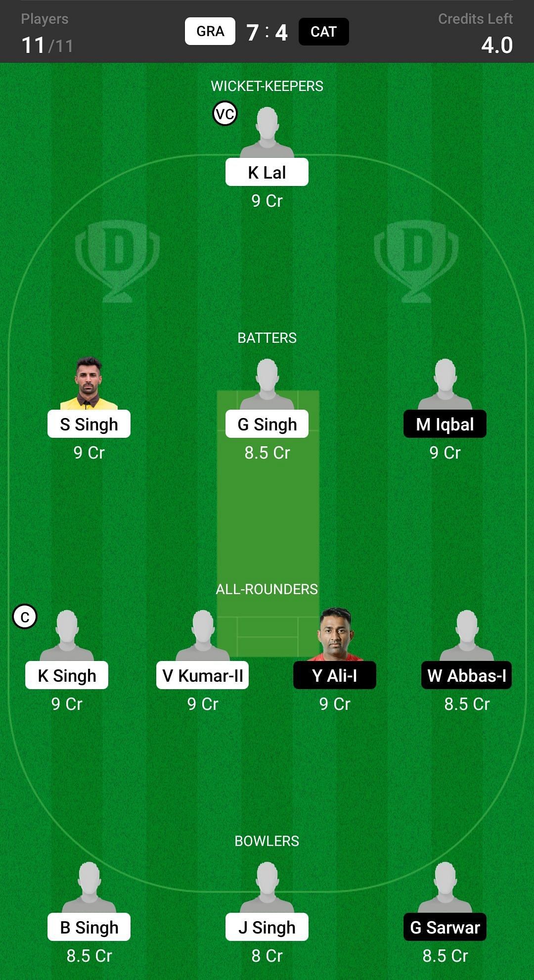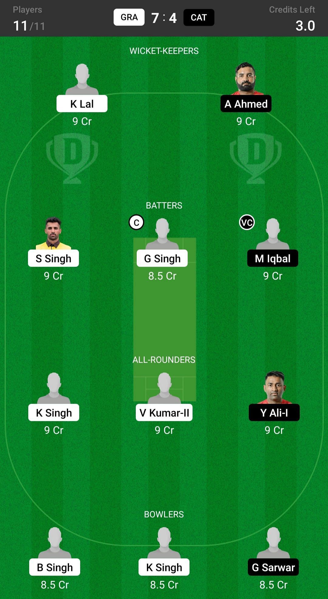 GRA vs CAT match captain and vice-captain choices