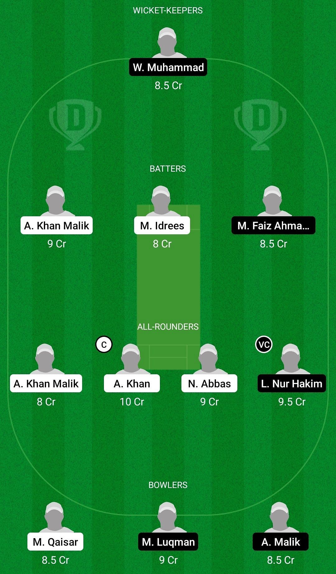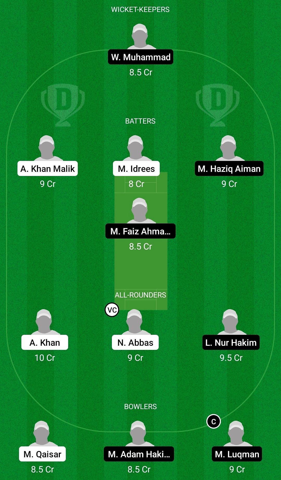 Fantasy Suggestion #1: Wan Muhammad, Aslam Khan-Bin-Malik, Mohsan Idrees, Muhammad Faiz Ahmad Nasir, Amir Khan Malik, Ajeb Khan, Nasir Abbas, Lokman Nur Hakim Sahar, Muhammad Qaisar, Muhammad Luqman Hakimi, Akram Malik.