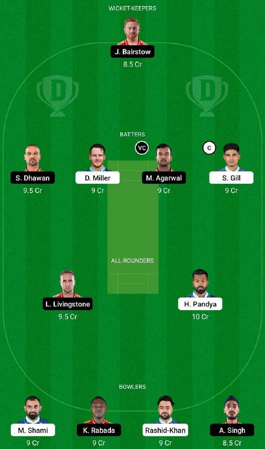 Fantasy Suggestion #2: Jonny Bairstow, Shikhar Dhawan, Shubman Gill, Mayank Agarwal, David Miller, Liam Livingstone, Hardik Pandya, Kagiso Rabada, Rashid Khan, Arshdeep Singh and Mohammed Shami.