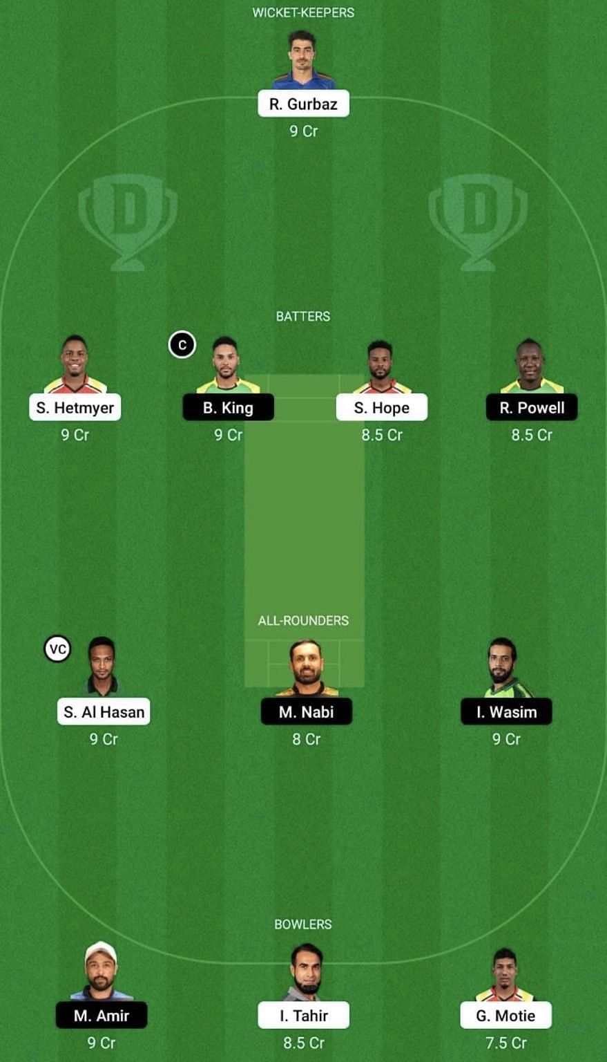 Rahmanullah Gurbaz (wk), Chandrapaul Hemraj, Shai Hope, Shimron Hetmyer (c), Shakib Al Hasan, Keemo Paul, Odean Smith, Romario Shepherd, Imran Tahir, Junior Sinclair and Gudakesh Motie