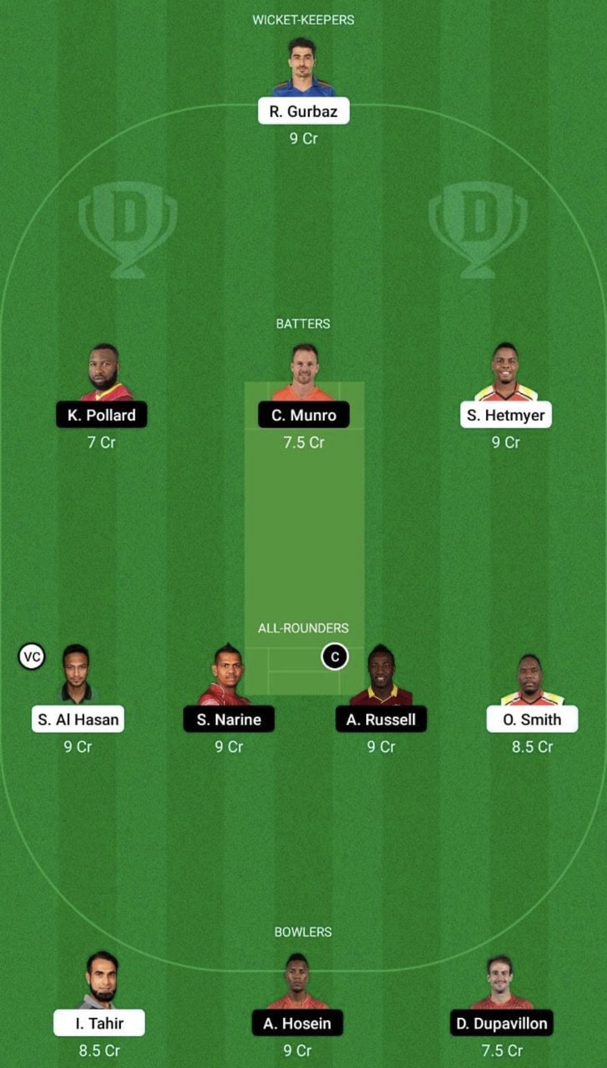 Akeal Hosein has been TKR's best bowler in recent matches, picking up nine wickets in five matches. While he has been a touch expensive on a few occasions, Hosein has held his own in the powerplay and middle overs. With Hosein capable of clearing the boundaries down the order, he is a good pick for the game.