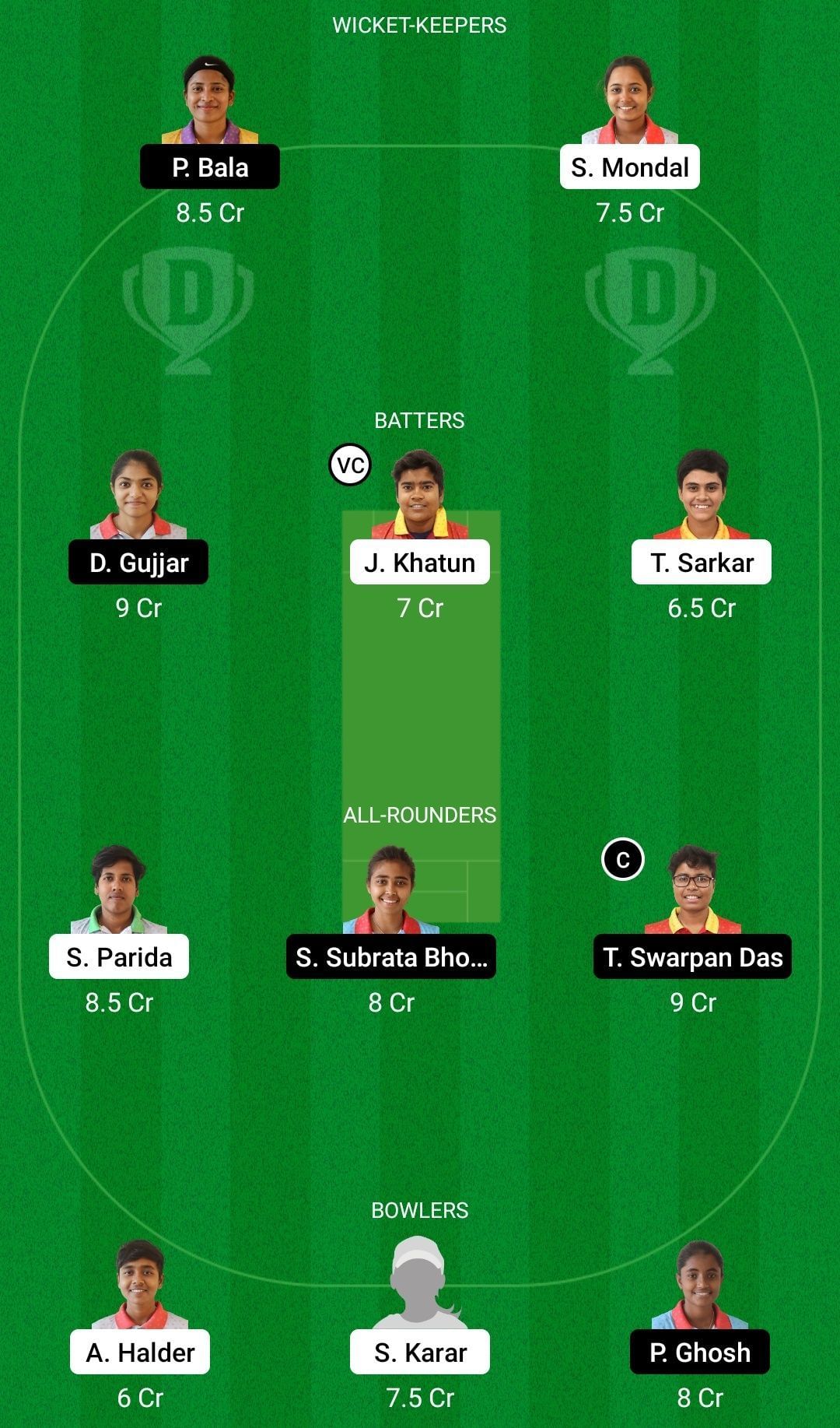 All-rounders could be the key in this game, so pick as many as possible. The likes of Dhara Gujjar, Sukanya Parida, Soumashree Subrata Bhowmick, Tithi Swarpan Das and Sonali Mondal could be key here.