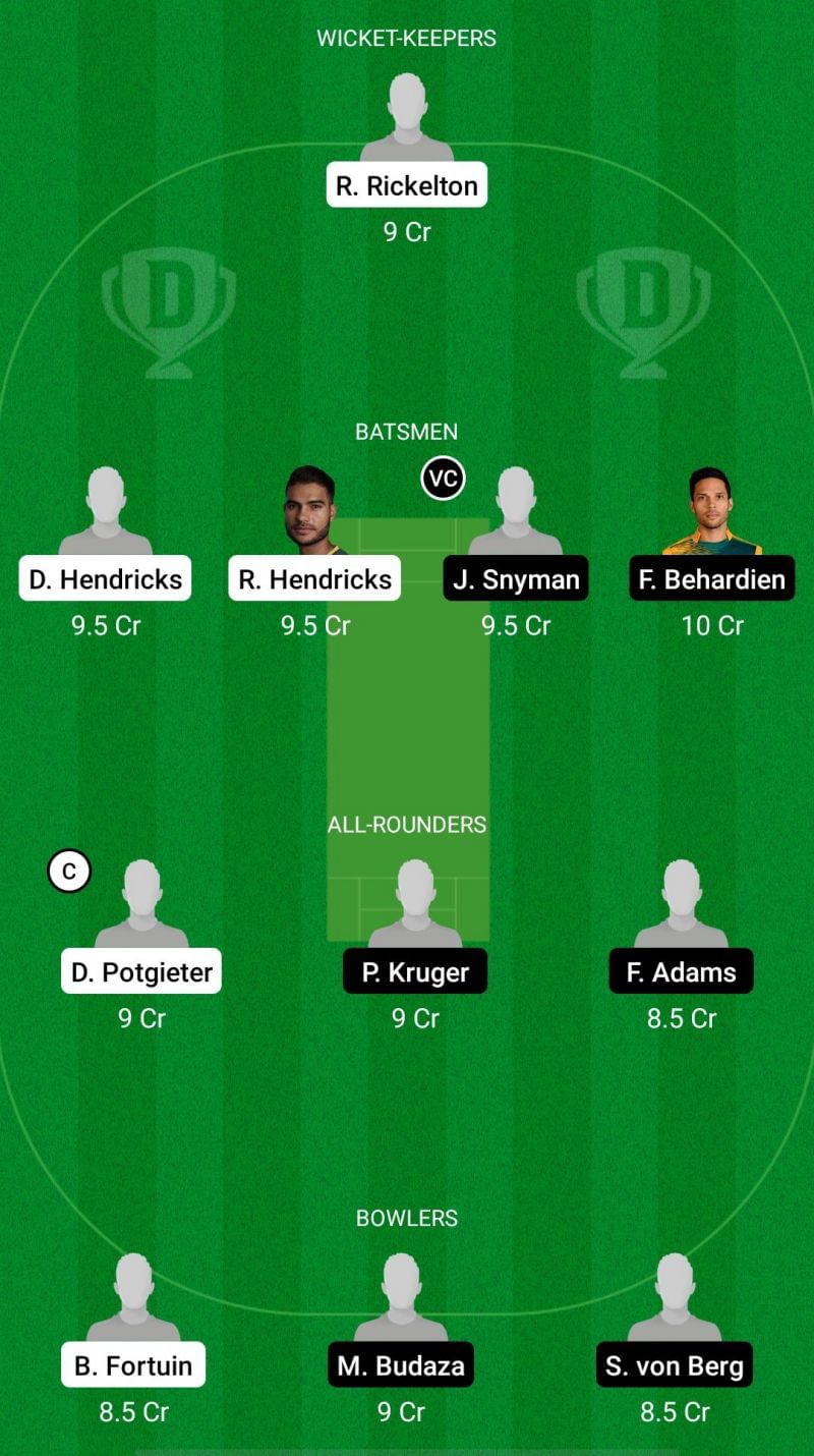 Fantasy Suggestion #1: Ryan Rickelton, Reeza Hendricks, Dominic Hendricks, Jacques Snyman, Farhaan Behardien, Delano Potgieter, Patrick Kruger, Ferisco Adams, Bjorn Fortuin, Shaun von Berg, Mbulelo Budaza.