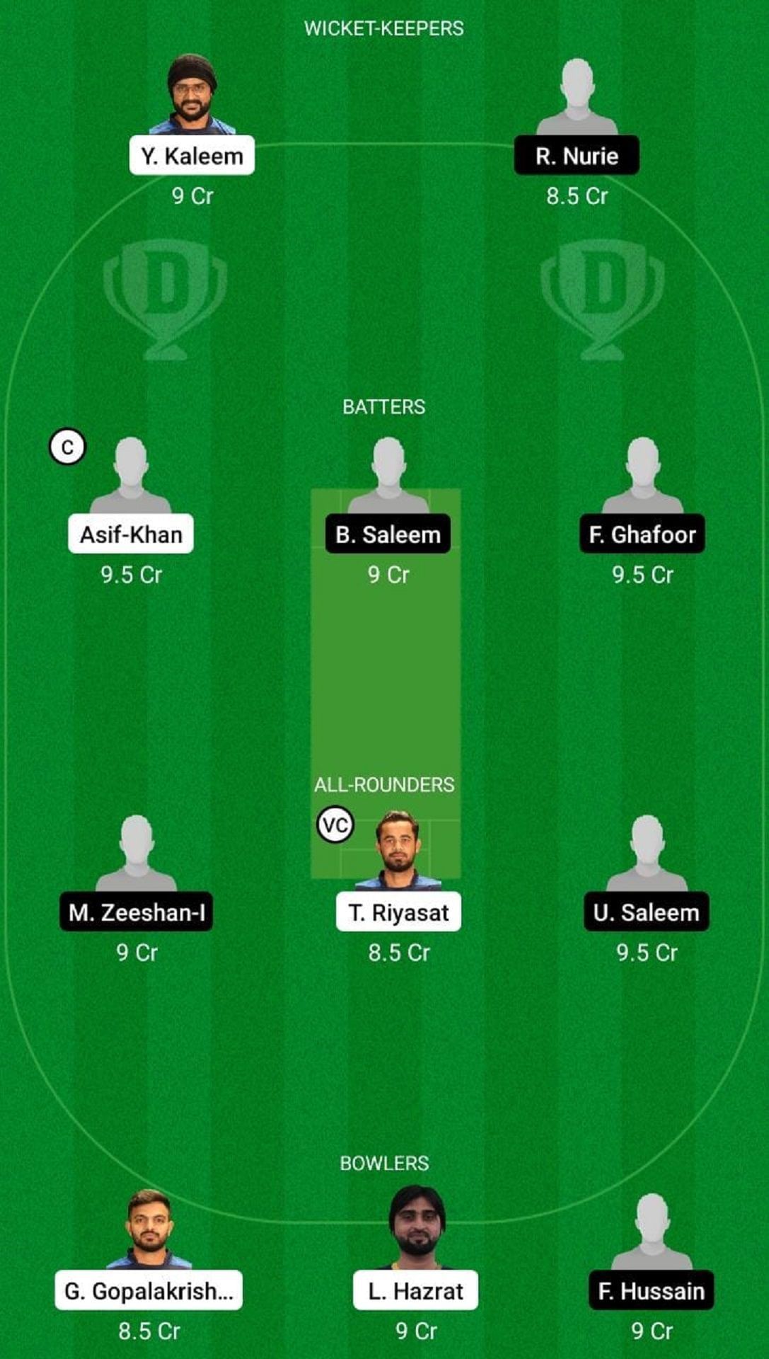 Fantasy Suggestion #1: Y Kaleem, R Nurie, Asif Khan, B Saleem, F Ghafoor, T Riyasat, M Zeeshan, U Saleem, L Hazrat, G Gopalakrishnan, F Hussain