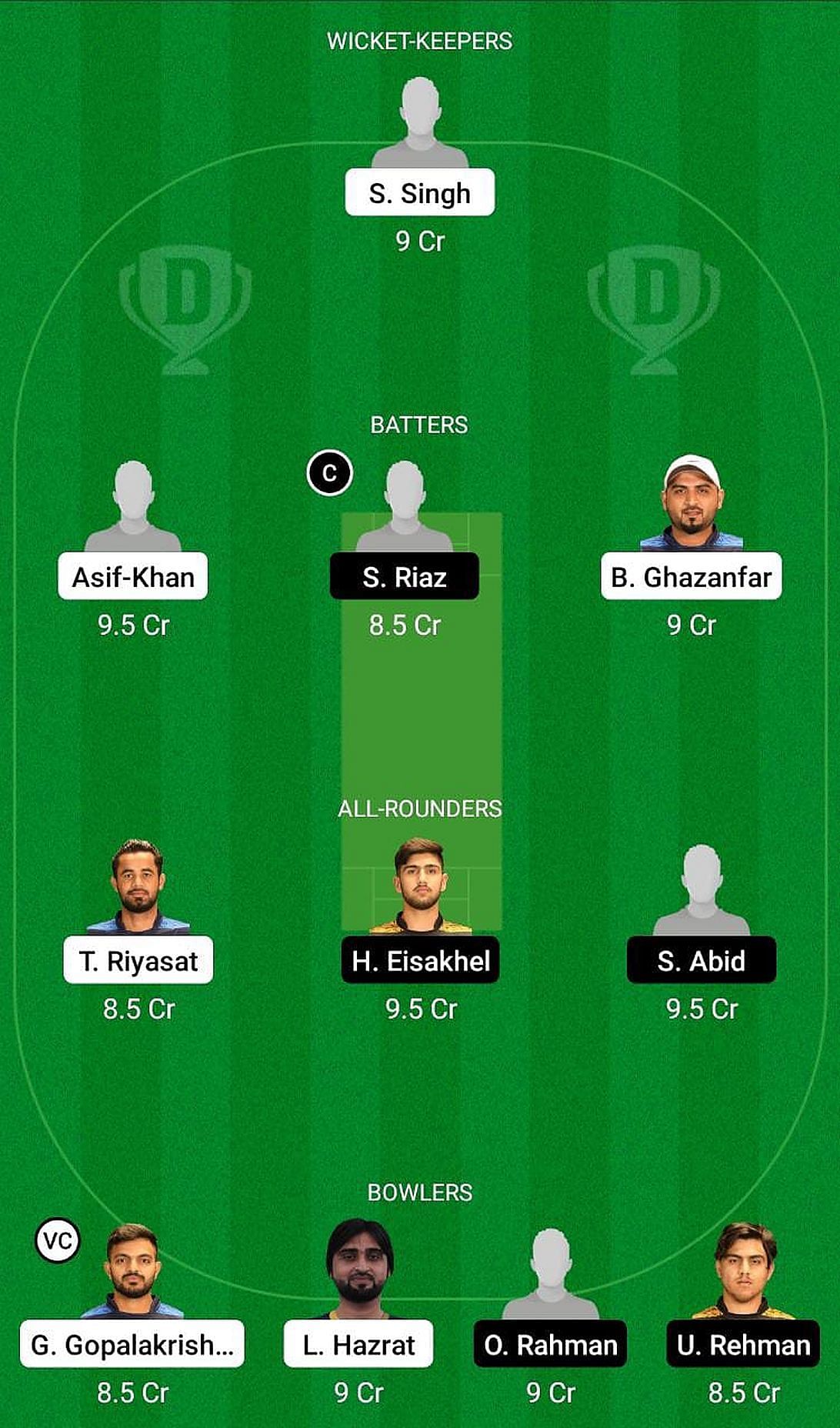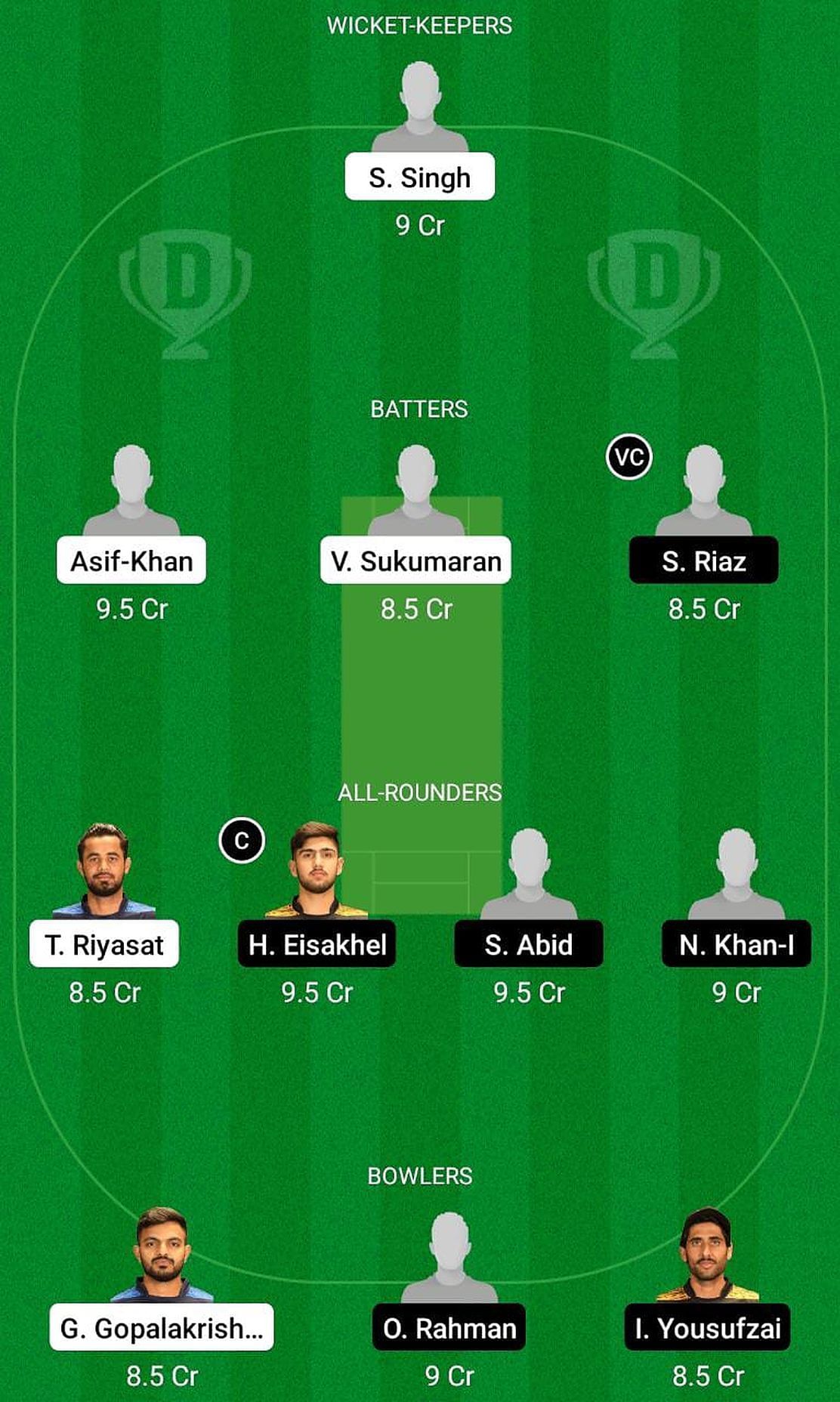 Fantasy Suggestion #1: Sandeep Singh, Asif Khan, Vishnu Sukumaran, Sajawal Riaz, Touqeer Riyasat, Hassan Eisakhel, Shoaib Abid, Niaz Khan, Gopakumar Gopalakrishnan, Omid Rahman, Irfan Yousufzai