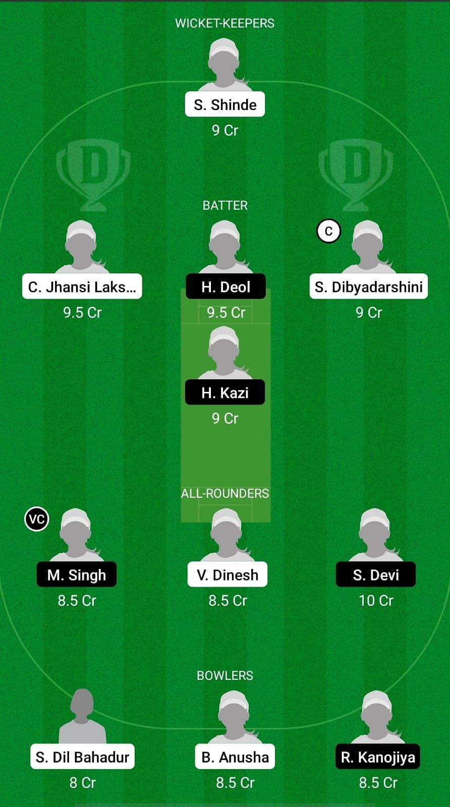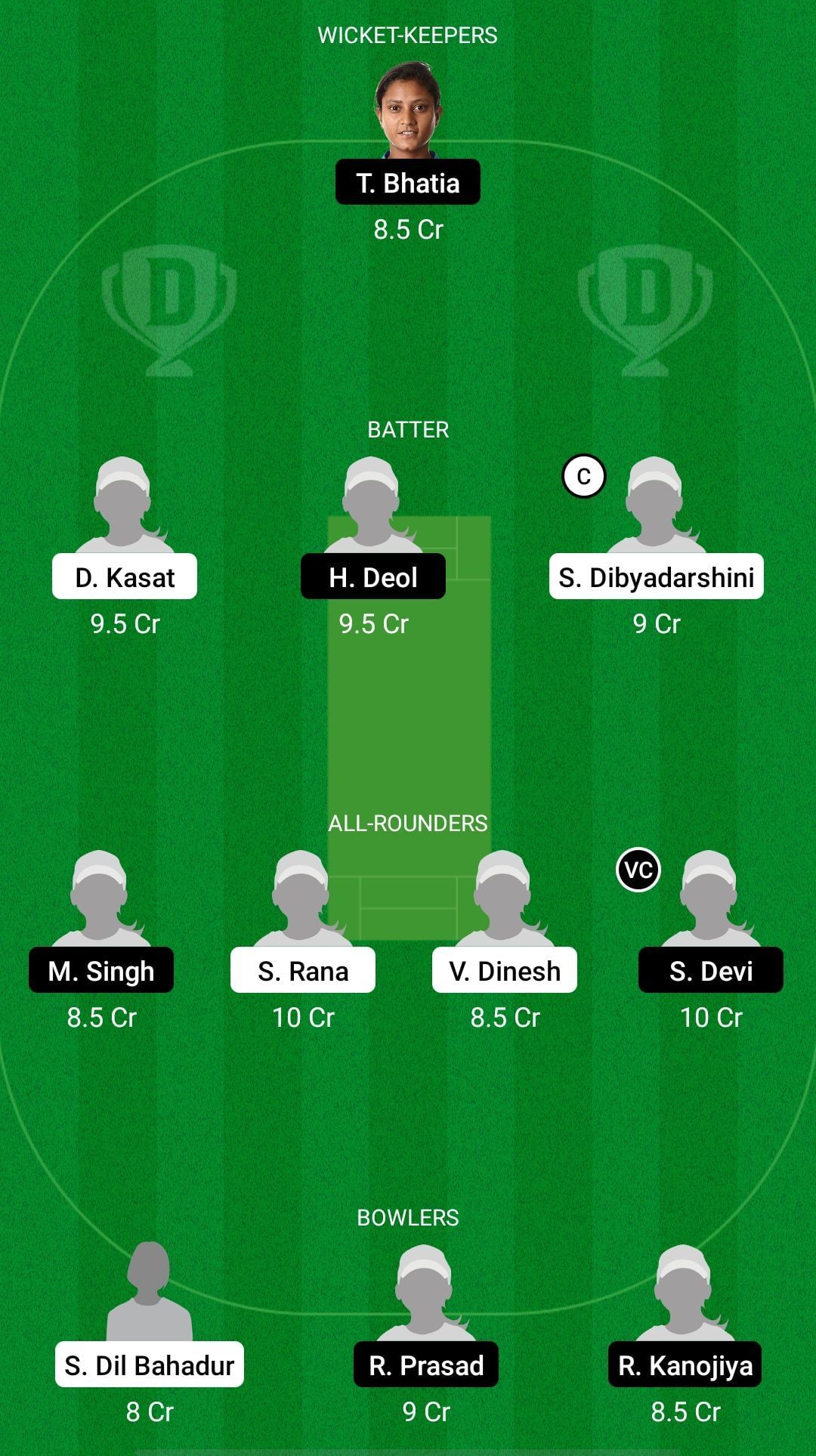 Fantasy Suggestion #1: Taniya Bhatia, Disha Kasat, Harleen Deol, Sushree Dibyadarshani, Meghna Singh, Sneh Rana, Vrinda Dinesh, Sarla Devi, Simran Dil Bahadur, Ramyashri Prasad, Rashi Kanojiya.