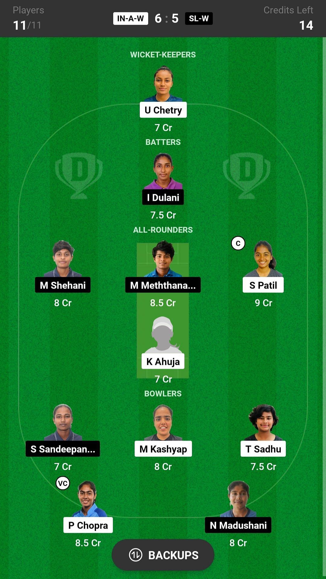 Bowlers: T Sadhu, M Kashyap, S Sandeepani, N Madushani, P Chopra