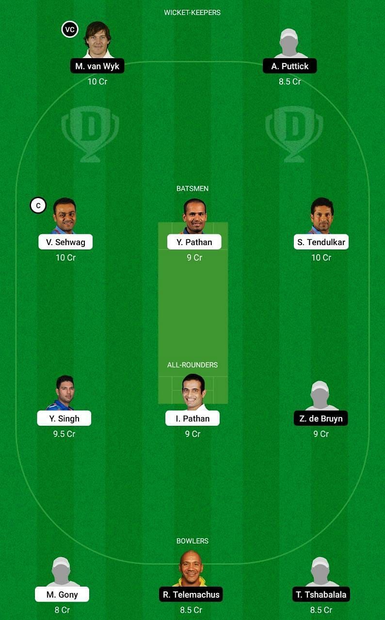 Fantasy Suggestion #1: A Puttick, M van Wyk, Y Pathan, V Sehwag, S Tendulkar, I Pathan, Y Singh, Z de Bruyn, T Tshabalala, M Gony, and R Telemachus