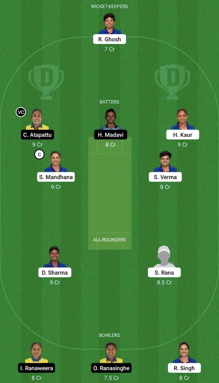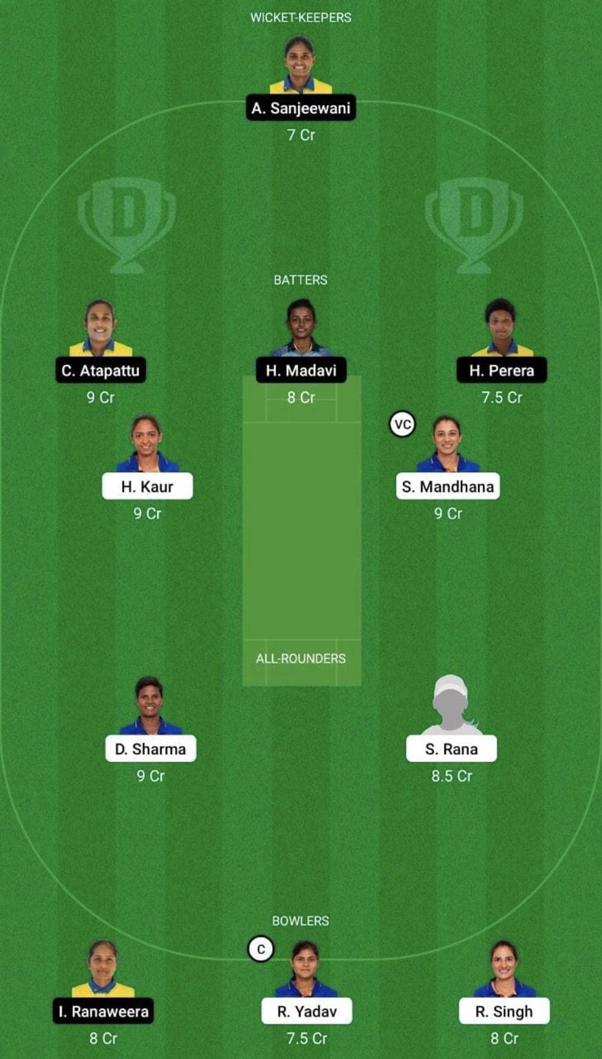 Batters: Chamari Athapaththu, Harshitha Madavi, Harmanpreet Kaur, Smriti Mandhana (vc), Hasini Perera