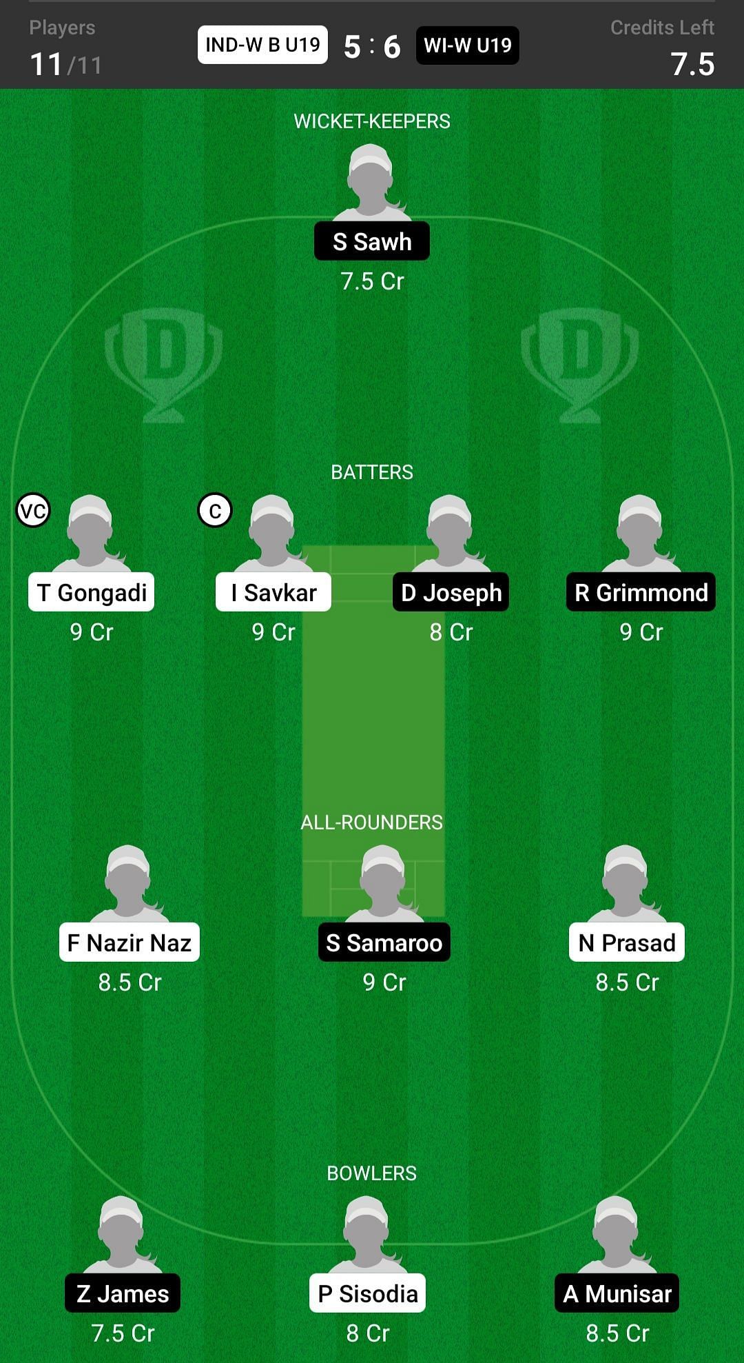 India B Women Under 19 vs West Indies Women Under 19 Dream11 Prediction Today, Grand League