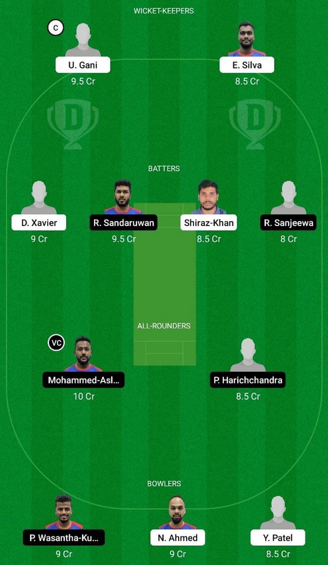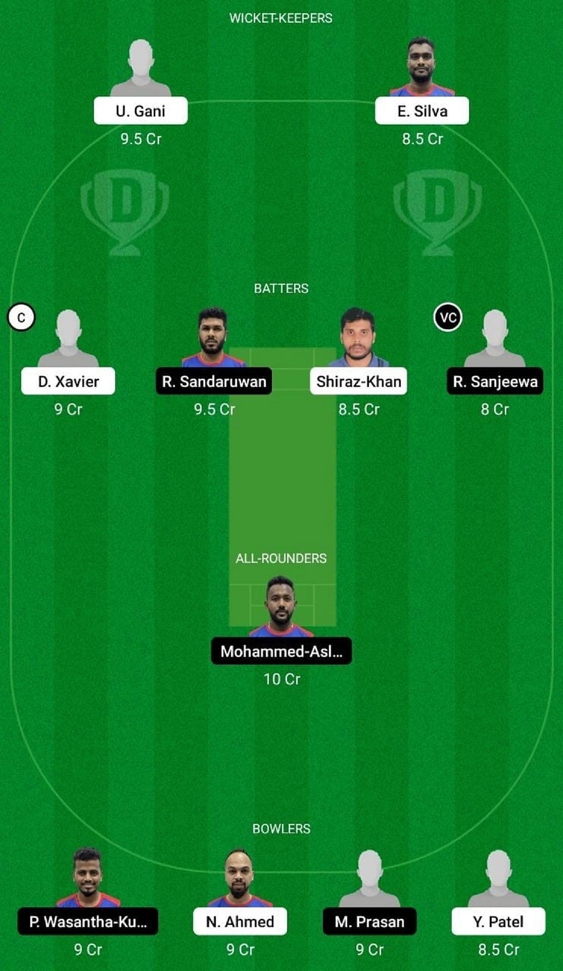 Fantasy Suggestion #1: U Gani, E Silva, D Xavier, R Sanjeewa, S Khan, R Sandaruwan, M Aslam, Y Patel, M Prasan, P Wasantha Kumar, N Ahmed