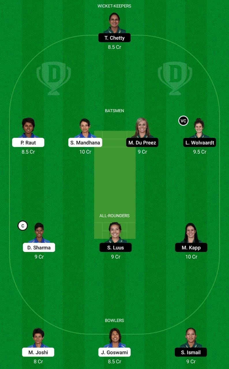 Fantasy Suggestion #1: T Chetty, L Wolvaardt, S Mandhana, P Raut, M du Preez, S Luus, D Sharma, M Kapp, J Goswami, S Ismail and M Joshi