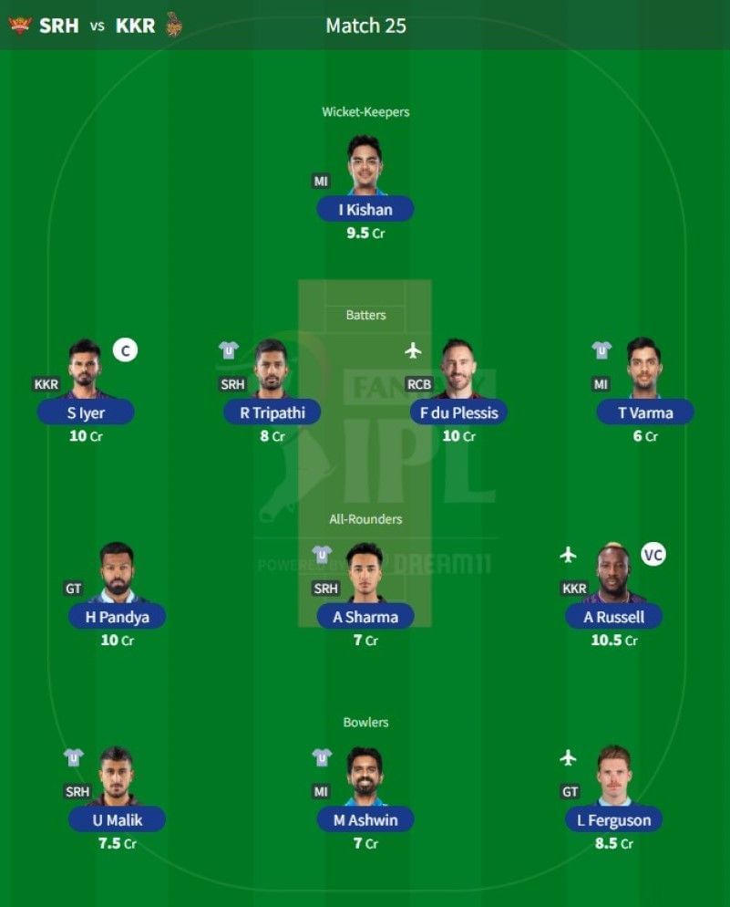IPL 2022 Fantasy Team for Match 25 - SRH vs KKR