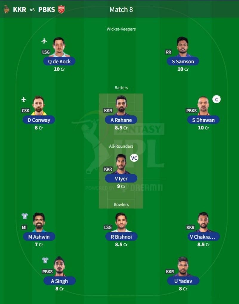 IPL 2022 Fantasy Team for Match 8 - KKR vs PBKS