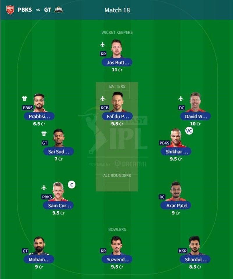 Players playing in Match 18: Prabhsimran Singh (BAT) (PBKS) (6.5 Credits), Sam Curran (ALL) (PBKS) (9.5 Credits), Shikhar Dhawan (BAT) (PBKS) (9.5 Credits), Sai Sudharsan (BAT) (GT) (7 Credits), and Mohammed Shami (GT) (BOWL) (9 Credits).