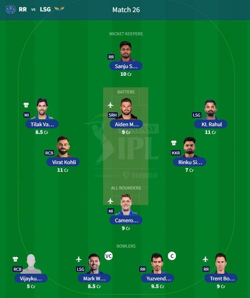 Players playing in Match 26: Yuzvendra Chahal (BOWL) (RR) (9.5 Credits), Sanju Samson (WK) (RR) (10 Credits), Trent Boult (BOWL) (RR) (9 Credits), Mark Wood (BOWL) (LSG) (8.5 Credits), and KL Rahul (BAT) (LSG) (11 Credits).
