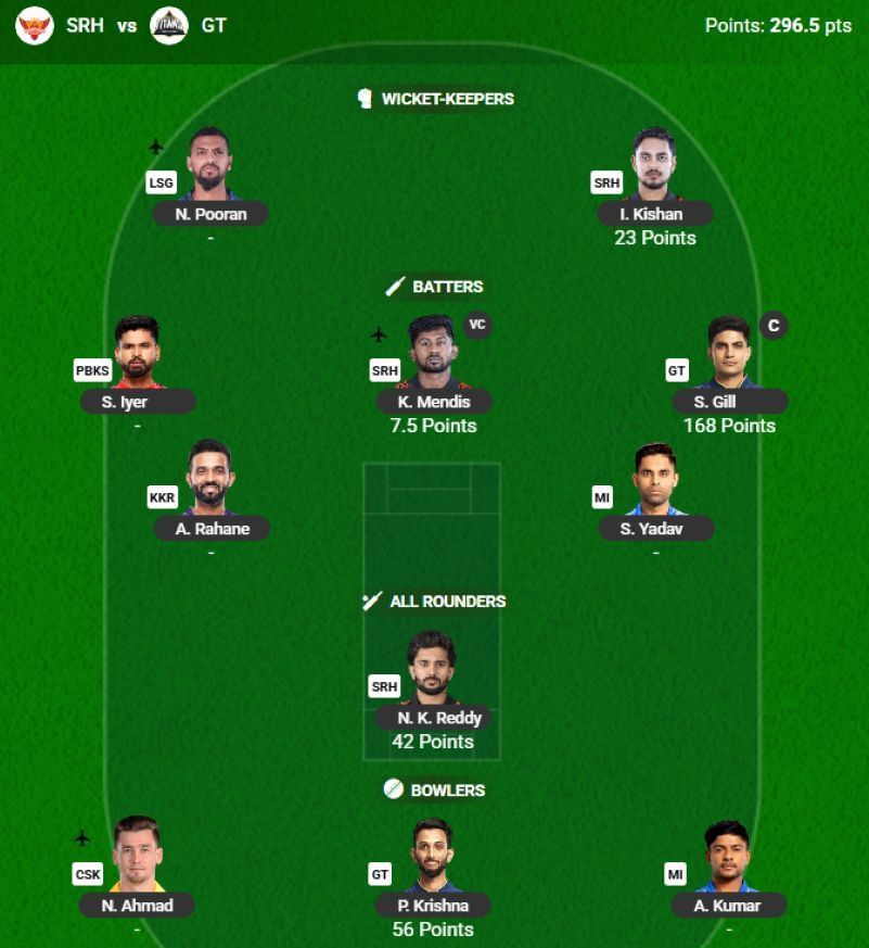 Players playing in Match 19: Ishan Kishan (SRH) (WK) (9 Credits), Nitish Kumar Reddy (SRH) (ALL) (9 Credits), Shubman Gill (GT) (BAT) (10 Credits), and Kamindu Mendis (SRH) (BAT) (8 Credits), and Prasidh Krishna (GT) (BOWL) (8 Credits).