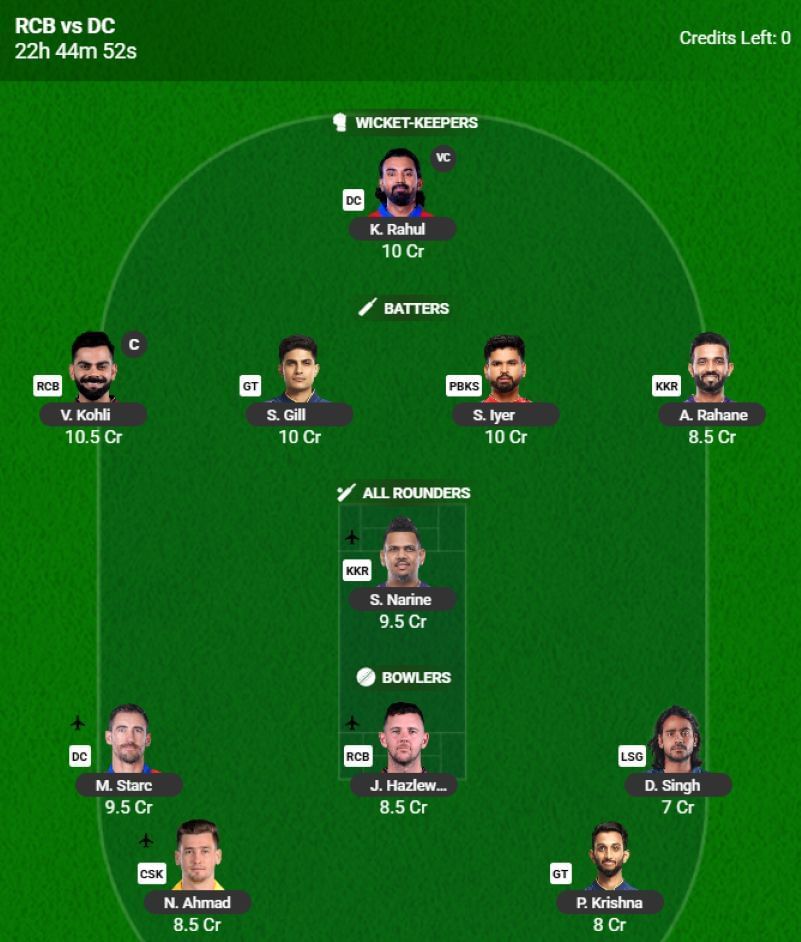 Players playing in Match 24: Virat Kohli (RCB) (BAT) (10.5 Credits), KL Rahul (DC) (WK) (10 Credits), Josh Hazlewood (RCB) (BOWL) (8.5 Credits), and Mitchell Starc (DC) (BOWL) (9.5 Credits).