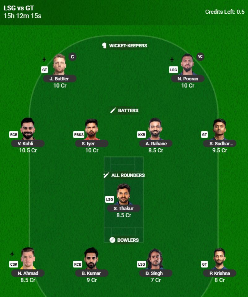 Players playing in Match 26: Digvesh Rathi (LSG) (BOWL) (7 Credits), Jos Buttler (GT) (WK) (10 Credits), Prasidh Krishna (GT) (BOWL) (8 Credits), Sai Sudharsan (GT) (BAT) (9.5 Credits), Shardul Thakur (LSG) (ALL) (8.5 Credits), and Nicholas Pooran (LSG) (WK) (10 Credits).